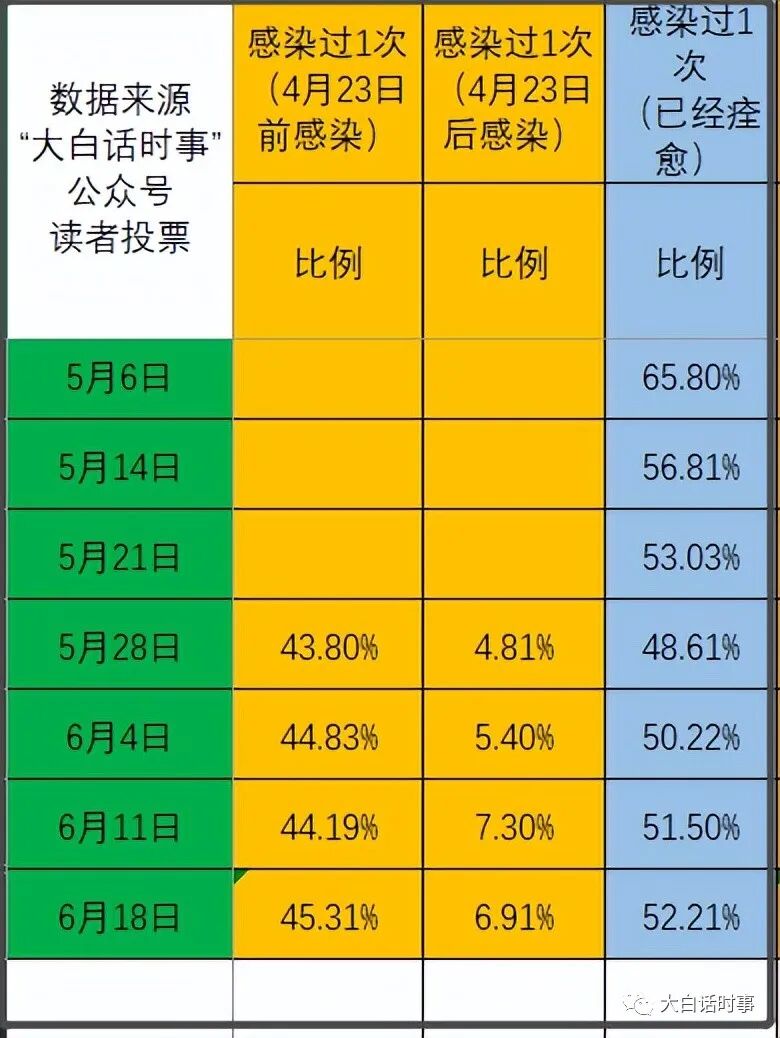 综合来看,当前全国范围内应该已经处于过峰状态,接下来主要观察6月底本轮疫情能否结束。大家也是比较关心这轮疫情何时结束,我相信是会体现在投票数据上,所以还是希望大家能积极参与投票。自从我2月开始每周日例行发这个投票以来,每次投票的人数,基本稳定保持在1.5万人左右。这份投票的可靠性,也是靠大家长期坚持投票,我也在这里谢谢大家的坚持。也是因为有大家能坚持投票,我也才能顶着压力,去坚持发这个投票,并做统计分析。