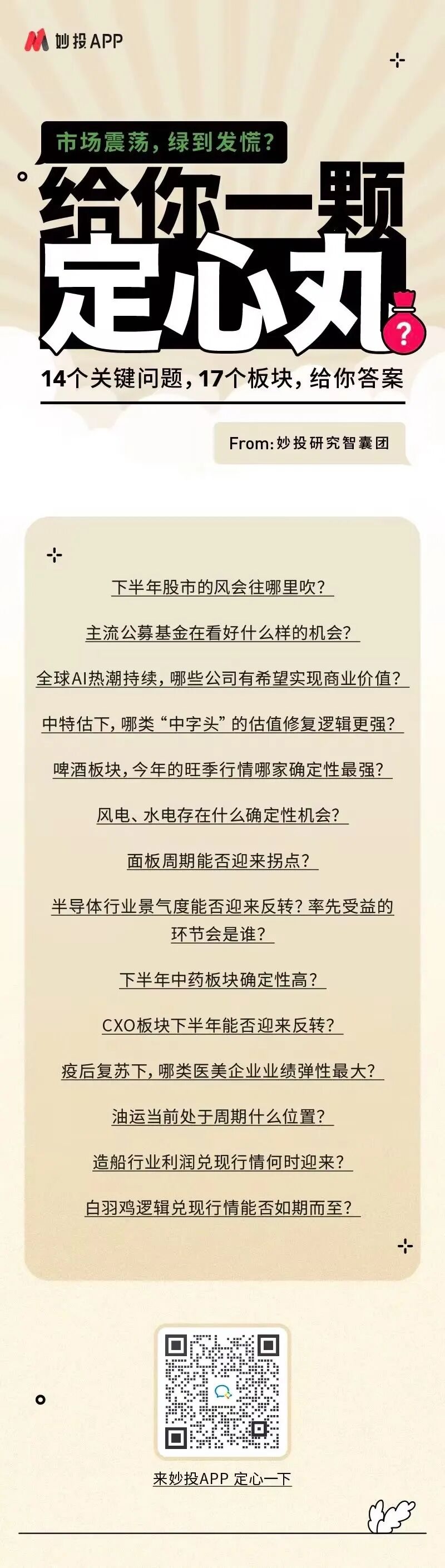 接下来,我们会用14个关键问题,覆盖17个板块机会,展望下半年的二级市场投资机会,本文仅展示各版块的逻辑,详细分析请移步妙投app阅读原文,妙投app也将持续为投资者追踪这些行业的趋势变化,挖掘潜力价值。