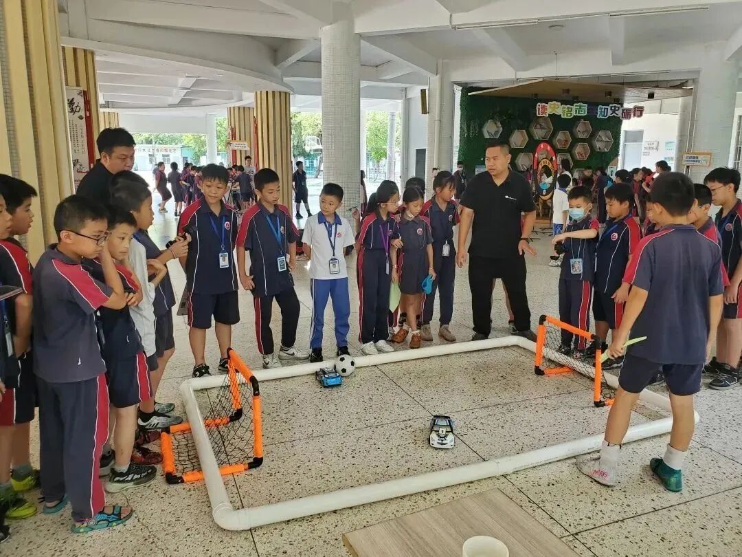 广东省汕头市龙湖区龙湖小学里热闹非凡——科技创新节活动正在火热进行。在机器人展示区,队员们听讲解员介绍手柄的使用方法,知道了如何遥控机器车的方向和速度。在生命科学展示区,许多动植物的标本被放置在展台上供队员们观察。
