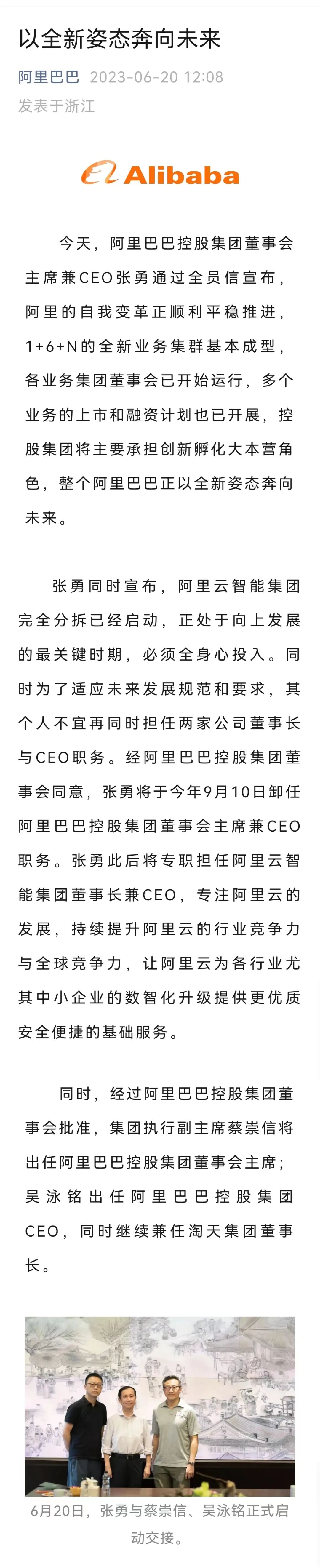 大家都知道,云计算、大数据和人工智能等核心技术的发展将会给社会带来巨大的变革,战略意义非常重大。目前云智能集团的完全分拆工作已经开始启动,正处于最关键时刻,要求必须全身心投入其中,同时也是考虑到分拆过程中公司规范化治理的要求,我个人不宜再同时担任两家集团的董事长和首席执行官的职责。因此,阿里巴巴集团董事会讨论并接受了我的请求:自2023年9月10日起,我将不再继续担任阿里巴巴集团董事会主席和首席执行官,而专心全职做好阿里云智能集团董事长兼首席执行官的工作。同时,阿里巴巴集团董事会决定,蔡崇信(Joe C. Tsai)将接替我成为阿里巴巴集团董事会主席,吴泳铭(Eddie Yongming Wu)将接替我成为阿里巴巴集团首席执行官。他们两位都是阿里巴巴的创始人和合伙人,都在阿里巴巴集团历史发展中做出了重要贡献,都拥有丰富的经验,相信在他们的领导下,公司能够走向更辉煌的未来。