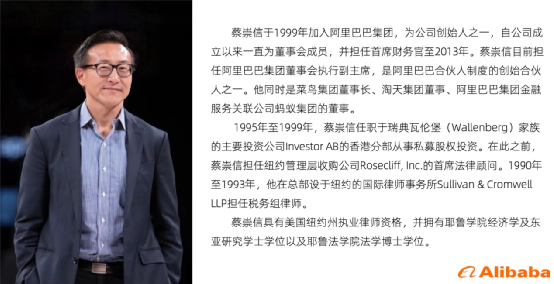 蔡崇信现任阿里集团执行副主席,在阿里巴巴诞生、发展历程中始终发挥着重要作用。从1999年公司成立到2013年,他担任了集团的CFO,并在2014年带领公司在纽约上市,之后负责战略投资工作。他的全球化经验和对宏观环境的洞察,对于阿里巴巴进一步推进国际化是有力的支撑;他对阿里巴巴发展历程的充分了解,对战略方向的把握以及对文化的传承,将会在未来帮助阿里集团持续发展。