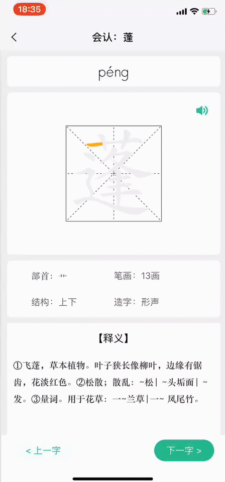 所有拼音都配有书写动画、读音,每一个字都有读音、字义、书写动画👇