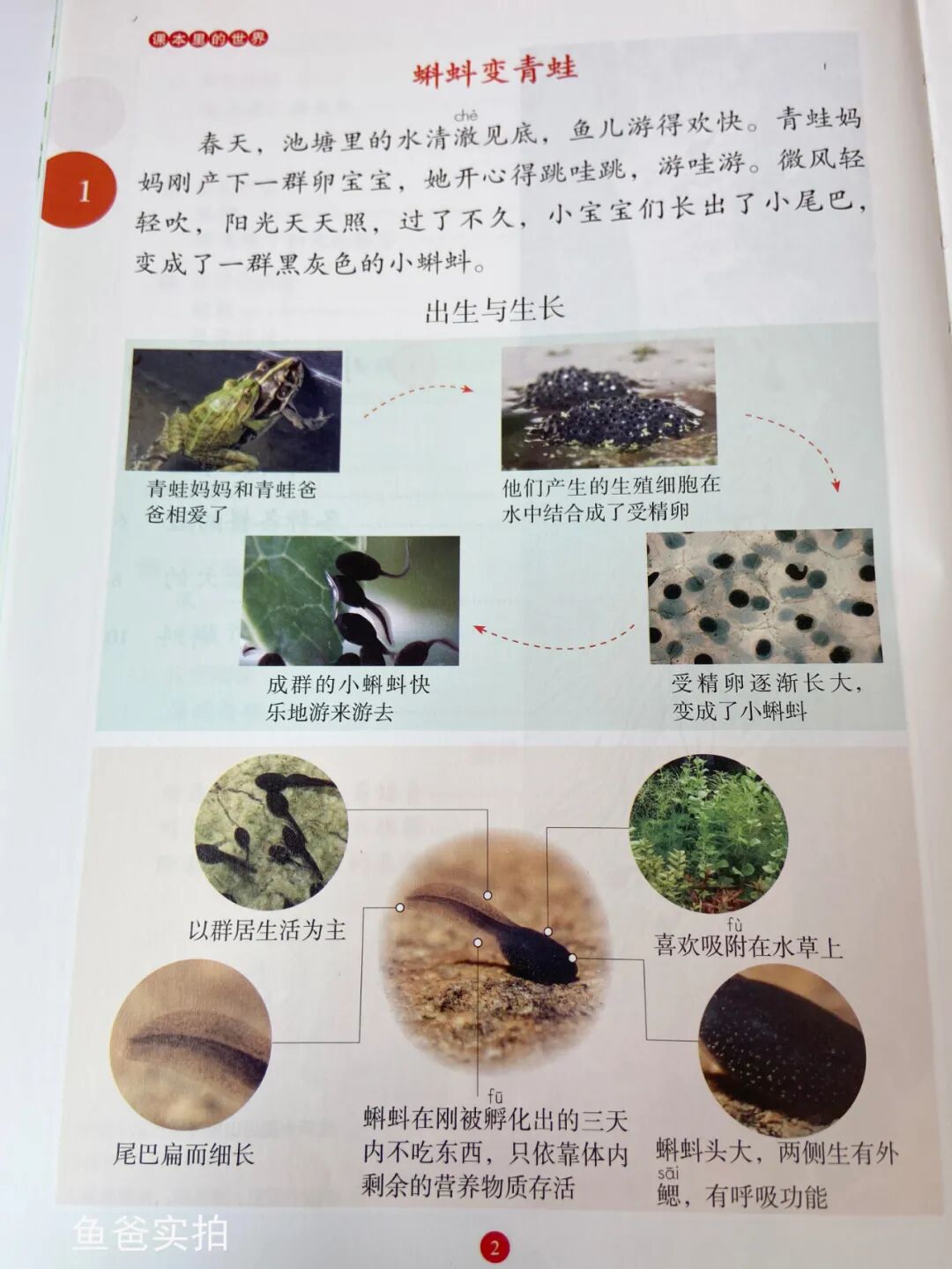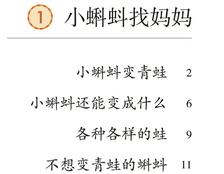 课文讲《小蝌蚪找妈妈》,那就对应拓展《小蝌蚪变青蛙》《小蝌蚪还能变成什么》《各种各样的蛙》,最后还有一篇和课文同类型的《不想变青蛙的蝌蚪》。