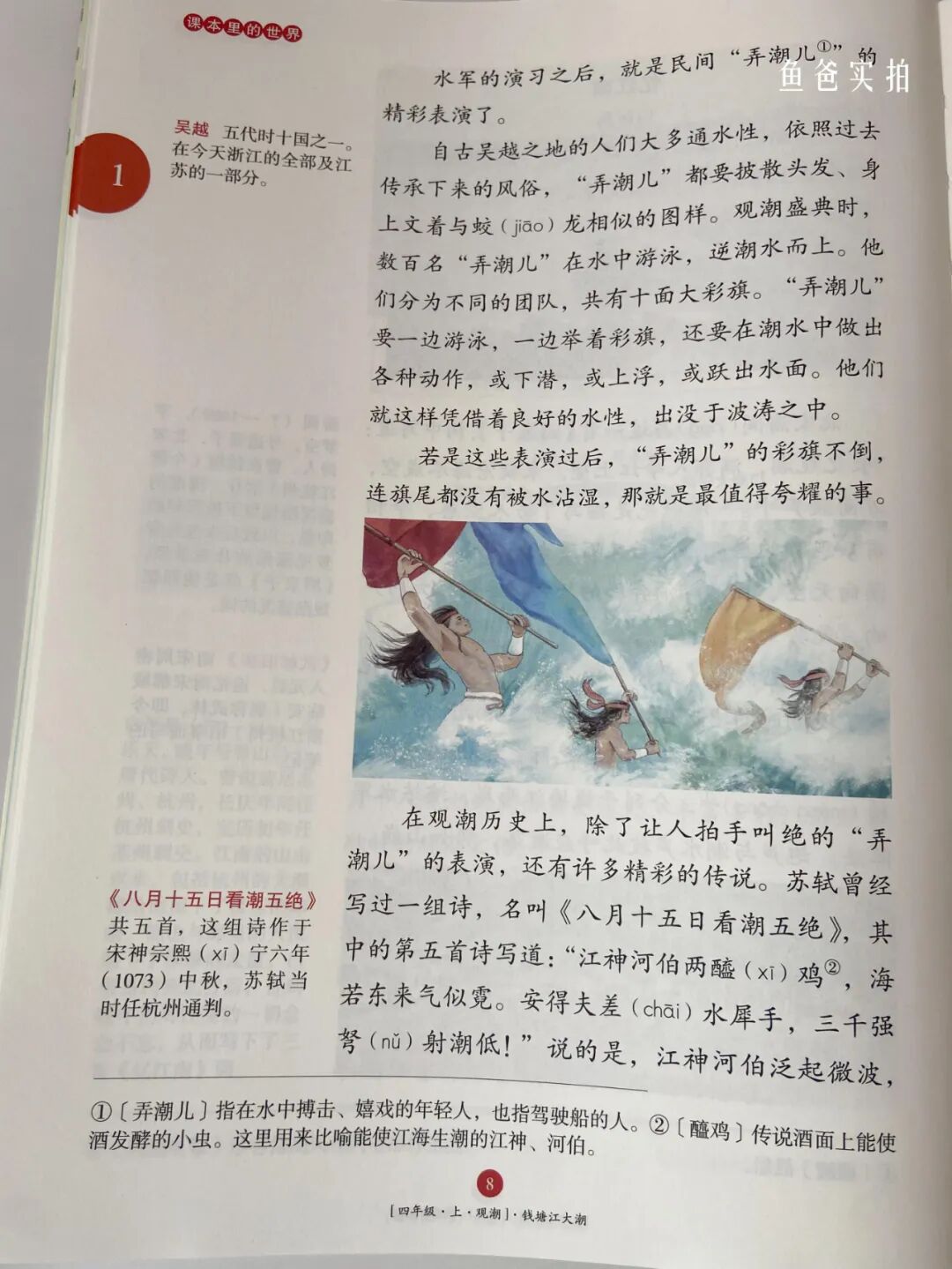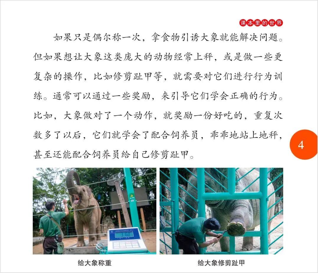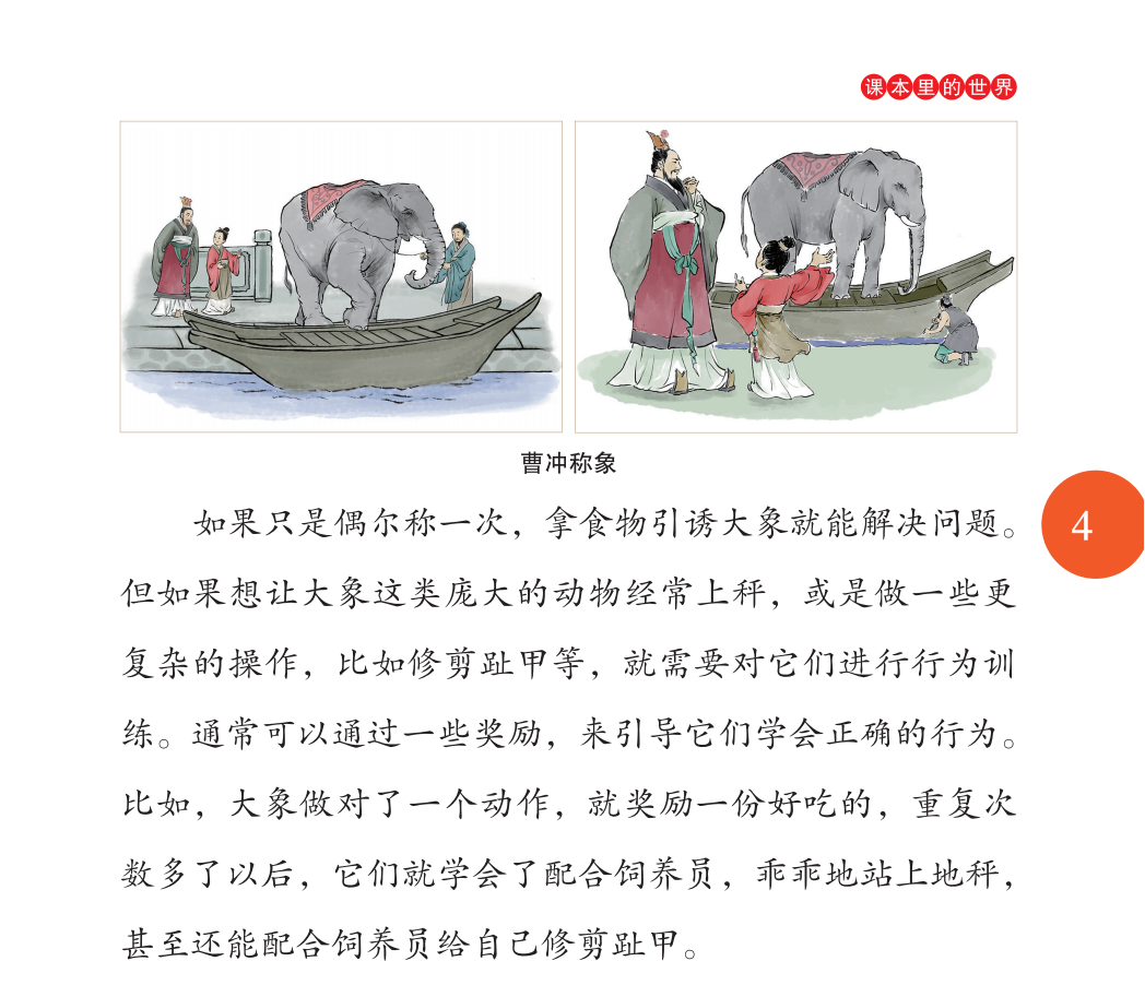 如:2上《年级阅读》中,把大家早已熟知的曹冲称象的插画配图,更换为了更符合文意、也更新奇有趣的饲养员给大象称重及修蹄的实景图。