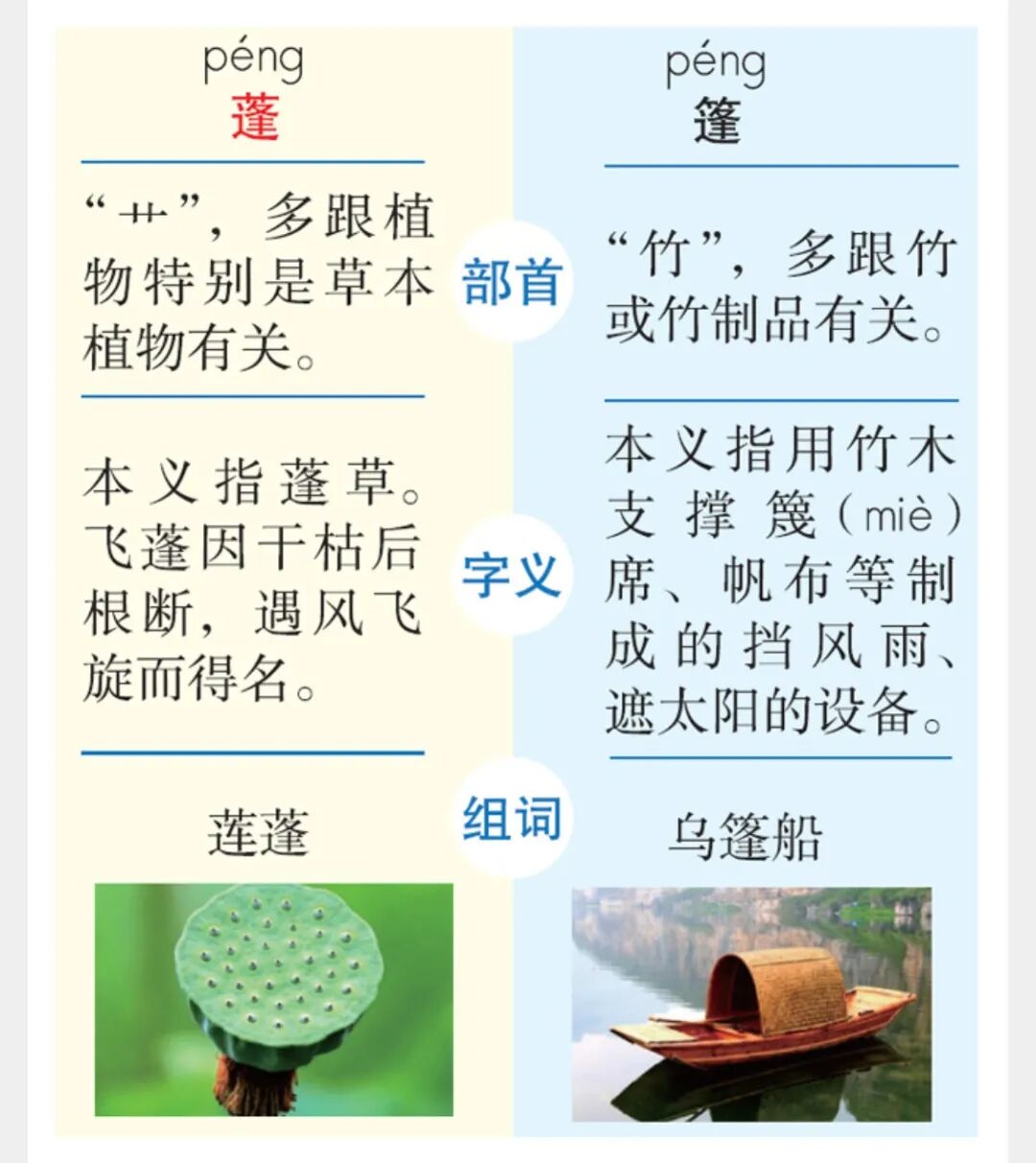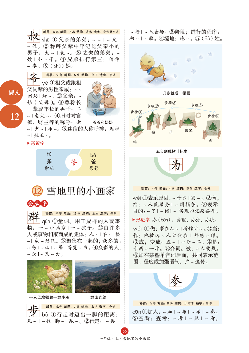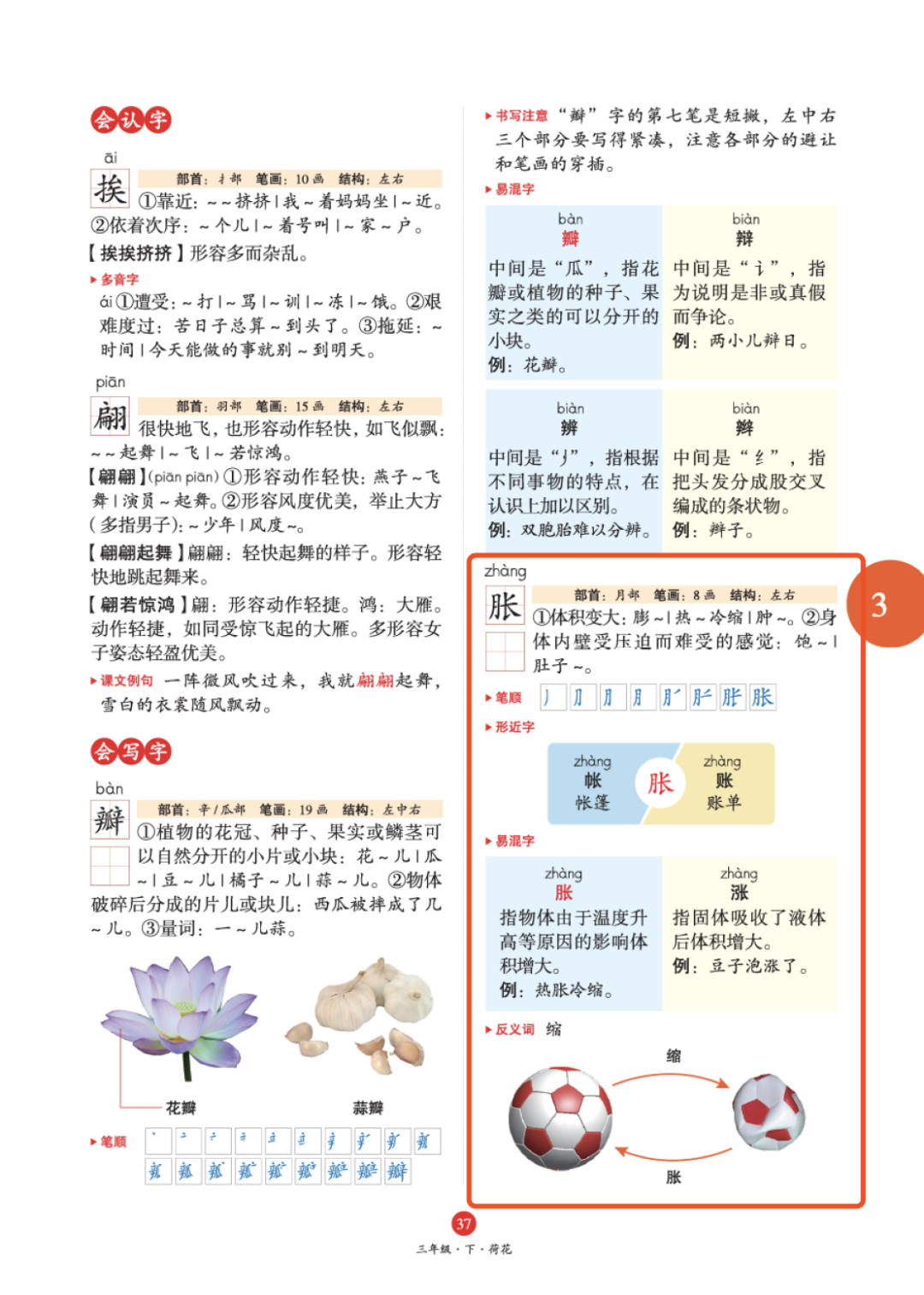 在每一课的最后一部分,《学习书》列出了本课所有需要掌握的会认字、会写字、词语学习,部首、笔画、笔顺、结构、释义、组词、多音字、形近字、易混词……