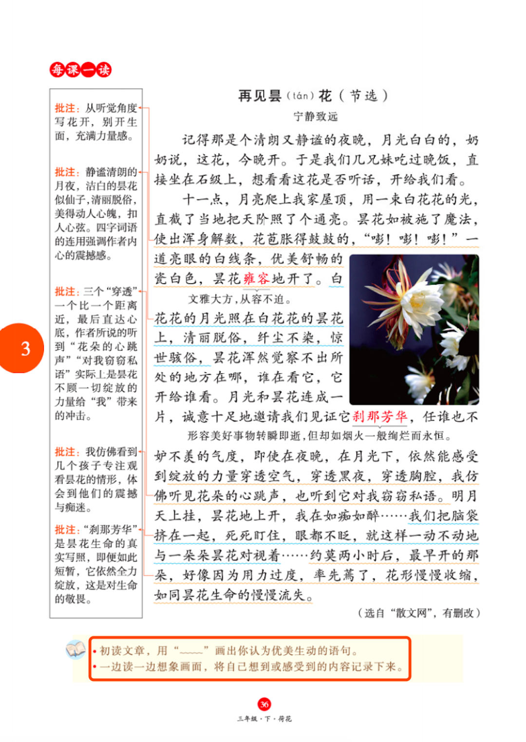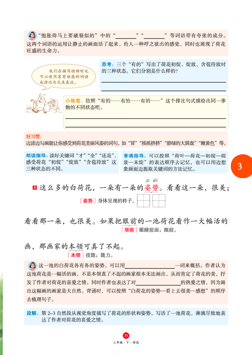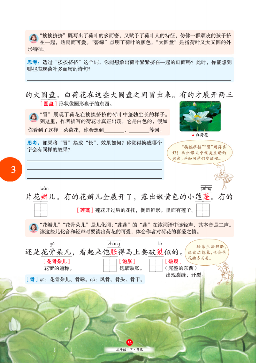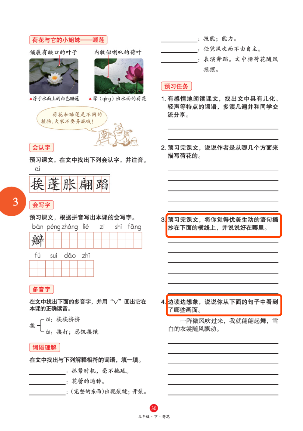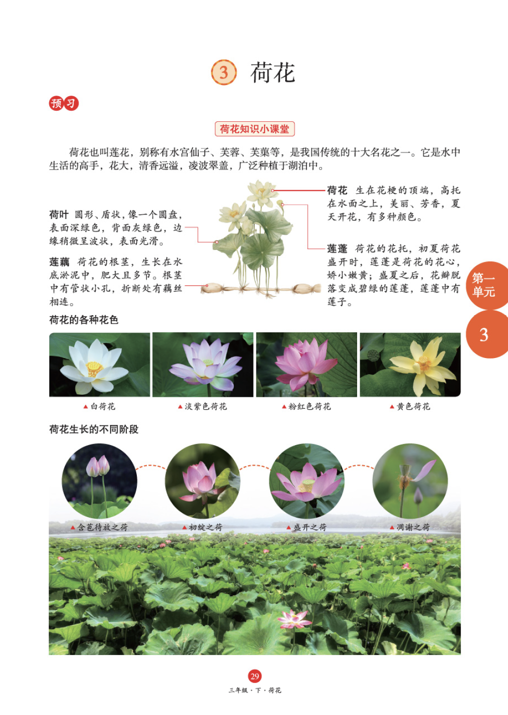 翻开《学习书》中本课的第一页,不是生硬的课文和生字,而是一篇关于荷花的知识小课堂。