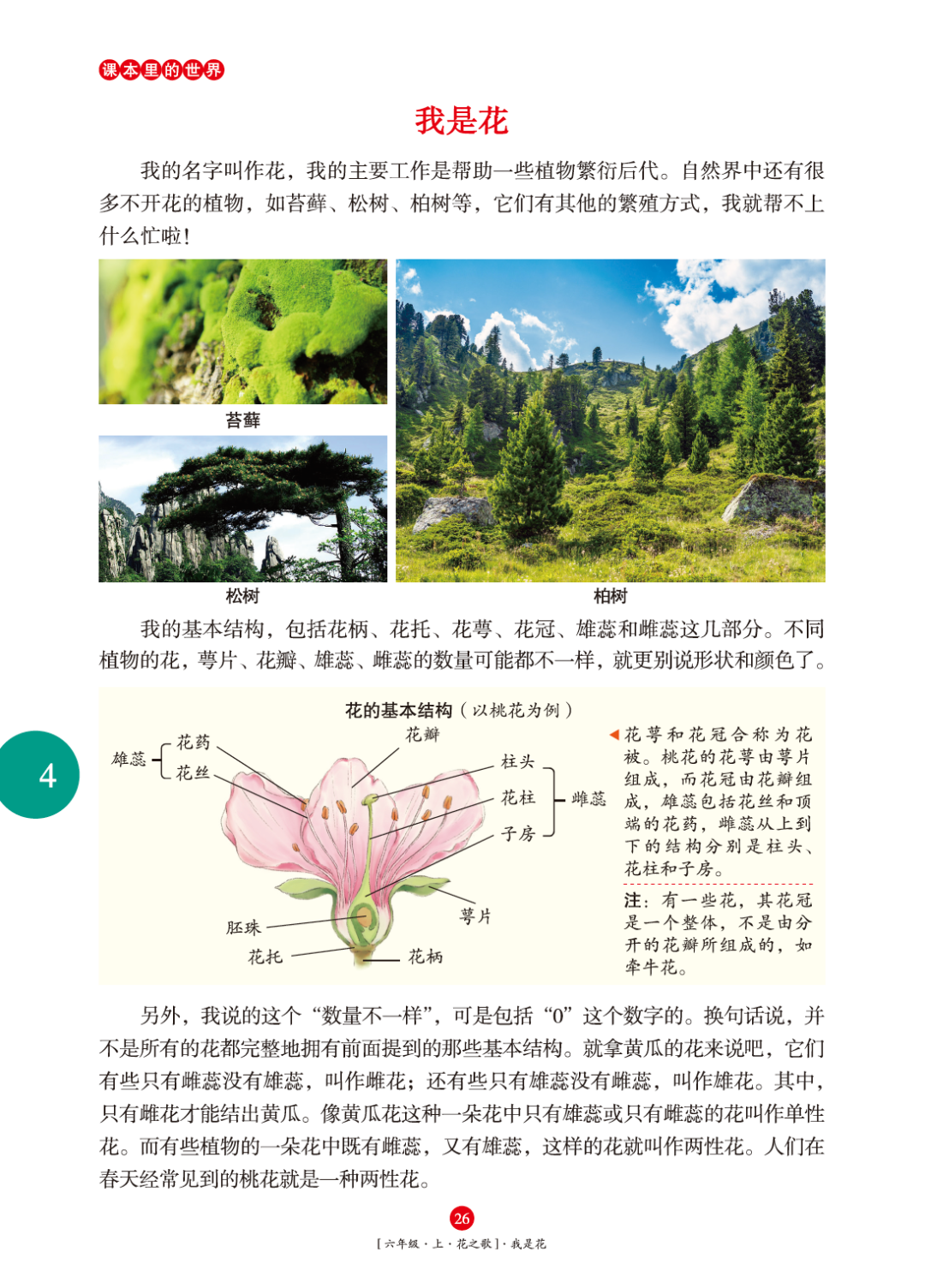 其中《我是花》特别邀请植物学硕士天冬老师编写,全篇运用第一人称,以花的口吻娓娓道来,主要工作、基本结构、开花传粉、象征寓意……配上精美的图片,不仅给孩子完成了科普,单从文章来看,简直也是一篇精彩的写物范文呀!