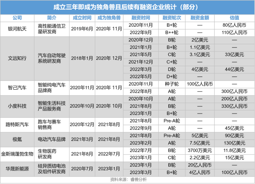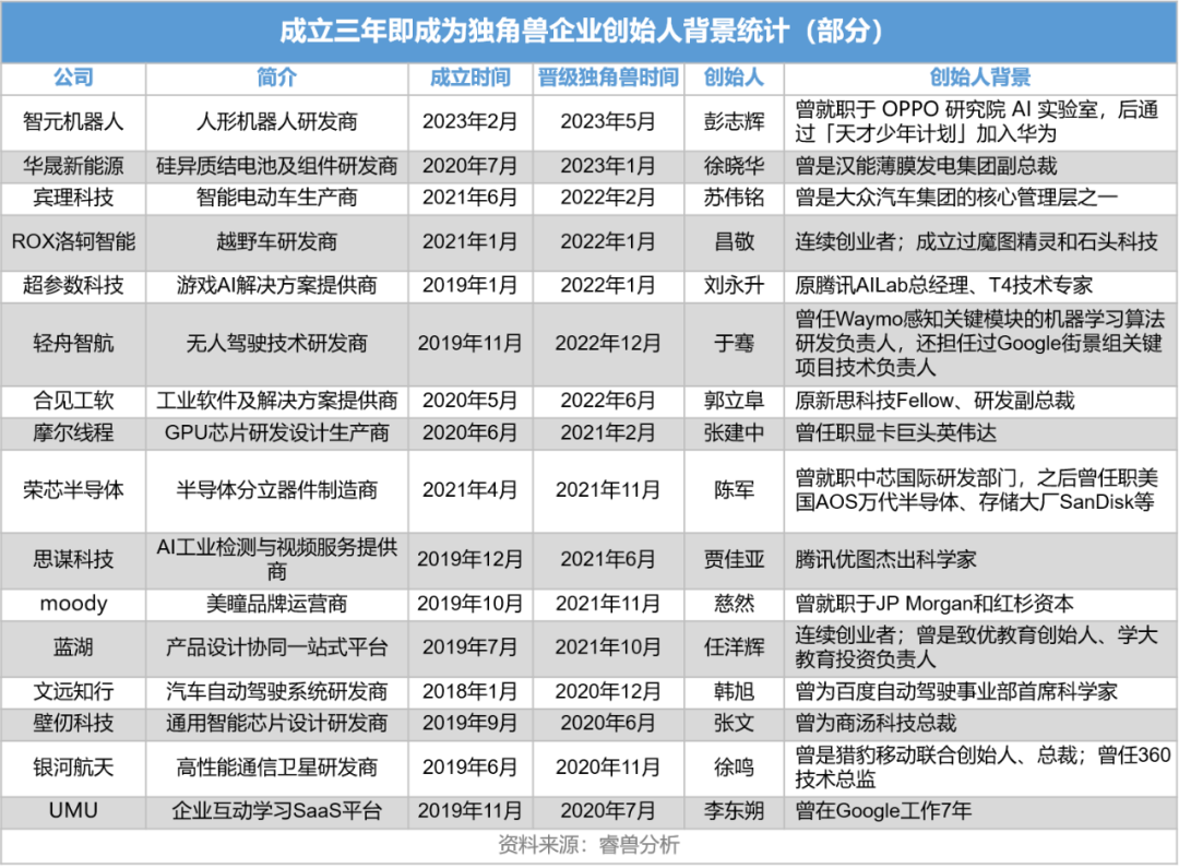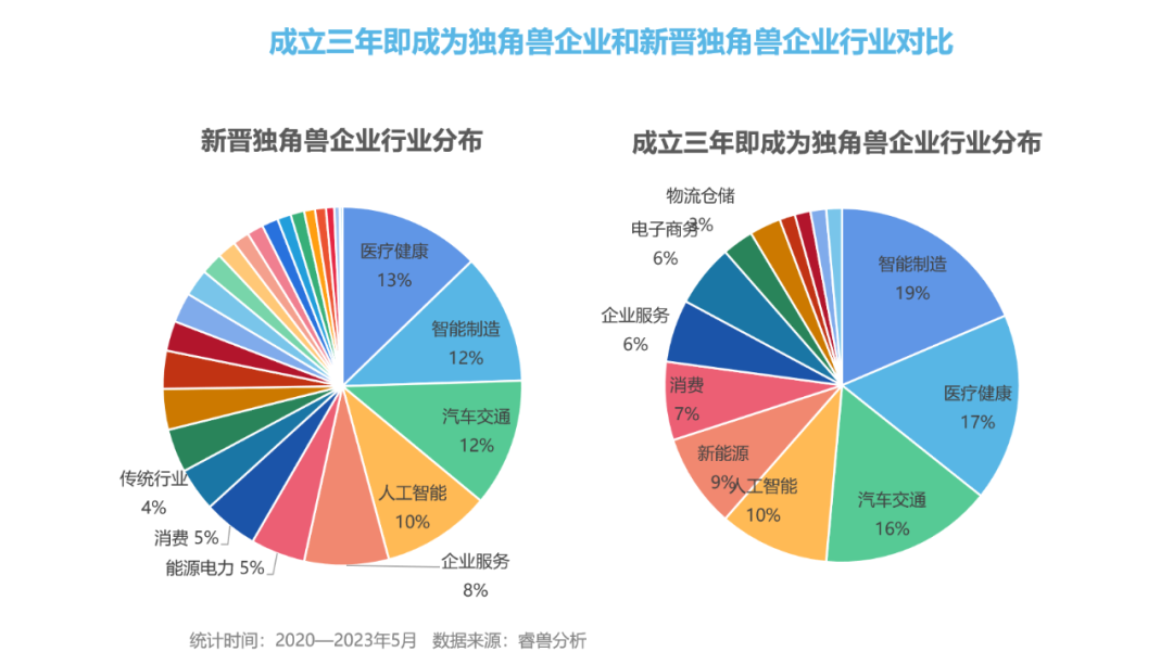 上月,“华为天才少年”彭志辉(B站科技类UP主“稚晖君”)缔造独角兽,仅用三个月时间。可能是中国创投市场缔造独角兽用时最短的一位创始人。这位“华为天才少年”曾任职OPPO研究院AI实验室,后通过“天才少年计划”加入华为。今年2月,他创办智元机器人公司。之后的短短3个月时间,这家公司先后完成天使轮和“天使轮+”融资,高瓴、百度风投、鼎晖等机构投资,“天使轮+”投后估值超10亿美元,自此,智元机器人成功晋级为独角兽。有公开数据显示,大多数独角兽企业从成立到成为独角兽,平均用时在3-8年。2020年至今,成立三个月就成为独角兽的企业大概只有含着金汤匙出生的极氪和小度科技。虽成立三个月即成为独角兽的企业凤毛麟角,但成立三年即成为独角兽的企业,在近几年频频出现。睿兽分析数据显示,2020-2023年5月,中国新晋独角兽321家,其中成立三年就晋升为独角兽的企业有70家,占比21.8%。这70家独角兽企业在行业分布上有何特点?为什么能在成立三年内估值就超10亿美元?以及这些在早期成为独角兽的企业后续在一级市场又有怎样的表现?本文将就此展开分析。睿兽分析数据显示,2020—2023年5月,中国新晋321家独角兽企业,主要集中在医疗健康、智能制造、汽车交通领域,占比分别为13%、12%、12%,三大行业合计占比37%,排在之后的为人工智能领域,占比10%,企业服务领域,占比8%。321家新晋独角兽中,70家企业在成立三年内晋升为独角兽,其行业TOP3分别是智能制造、医疗健康及汽车交通,占比分别为19%、17%、16%。人工智能紧随其后,占比10%,新能源占比9%。成立三年成为独角兽企业行业集中度要高于新晋独角兽企业,尤其在智能制造及医疗健康领域,70家企业中两大行业占比达36%,较新晋独角兽企业高11个百分点。智能制造领域,2020—2023年5月的三年多时间,合计48家企业跻身独角兽,其中成立三年内即成为独角兽的企业有13家,占比27%。如成立于2021年4月的半导体材料研发商丽豪半导体在2022年8月完成22亿B轮融资后,晋升为独角兽。通用智能芯片设计研发商壁仞科技成立于2019年9月,2020年6月完成11亿A轮融资,估值突破10亿美元。医疗健康领域,2020—2023年5月的三年多时间有52家企业成为独角兽,其中12家企业在成立三年内跻身独角兽行列,占比23%。生物医药服务商威斯克生物成立于2020年7月,第二年4月其完成Pre-A轮融资,成为独角兽。基因治疗药物研发商方拓生物成立于2020年,2022年7月获1.6亿美元B轮融资,跻身独角兽俱乐部。医疗健康领域虽近几年新晋独角兽企业高于智能制造,但成立三年成为独角兽企业却低于智能制造,这也在一定程度上说明,智能制造领域新锐企业较多且一级市场资本投资热度更高,更敢于下注。怎样的企业有机会快速晋级独角兽?企业基因和创始人背景或成为企业早期闯入独角兽阵营的两大筹码。一级市场成立三年成为独角兽企业多在智能制造及医疗健康领域,与这些领域本身资金投入较高,前期资金需求量较大有关。而除行业因素外,企业本身“基因”以及创始人背景也是企业在一级市场的加分项。筹码越大,越容易成为独角兽。首先是企业本身“基因”,具体来说即企业直接从巨头公司中拆分出来独立融资的公司,如上文提到的极氪和小度科技,分别源自吉利和百度内部分拆出来的项目。这些企业在独立面向资本市场时,已组建较为成熟团队,加之大公司平台和资源支持,企业发展速度加快。另外,大公司品牌背书,更容易得到资本关注和青睐,也更容易实现估值翻倍。另外,东风汽车旗下智能电动汽车品牌岚图汽车,成立于2021年6月,2022年其以300亿估值获中国国有企业混改基金、中国银行、工商银行、湖北高投等合计45.5亿投资;滴滴旗下滴滴货运及滴滴沃芽也先后在成立三年内成为独角兽;京东旗下京东工业成立于2020年,在首次独立融资时,估值就达到独角兽级别。总体而言,大企业内部独立分拆出来的项目自带“明星”光环和资源,可谓含着“金钥匙”出生;而另一些成立三年内即成为独角兽的企业,则是创始人即企业背后的掌舵者,大有来头。睿兽分析对近几年部分成立三年即成为独角兽企业的创始人背景进行分析,发现其或有名企背景,或是连续创业者。如GPU芯片研发设计生产商摩尔线程创始人张建中曾任职显卡巨头英伟达;汽车自动驾驶系统研发商文远知行创始人韩旭曾为百度自动驾驶事业部首席科学家;通用智能芯片设计研发商壁仞科技创始人张文曾为商汤科技总裁。另外,越野车研发商ROX洛轲智能创始人昌敬及产品设计协同一站式平台蓝湖创始人任洋辉均是连续创业者。不管是行业本身因素还是企业基因或是创始人背景,能在成立三年就跻身独角兽阵营,都为企业后续发展提供了加速度。但在瞬息万变的资本市场,成为独角兽只是万里长征的第一步。而2020年至今,三年晋升为独角兽的70多家早期企业中,后来在一级市场发展如何?睿兽分析数据显示,2020年至今70家成立三年即成为独角兽的企业中,合计有27家企业在估值达到10亿美金成为独角兽后又在一级市场达成新融资,其中只有一家企业估值现已超100亿美金,成为超级独角兽。具体来说,成立三年内且在2020年成新晋独角兽的企业有15家,15家企业中有12家企业在估值达到10亿美元成为独角兽又在一级市场达成融资。比如,文远知行更是成为独角兽之后又先后获5轮融资。文远知行成立