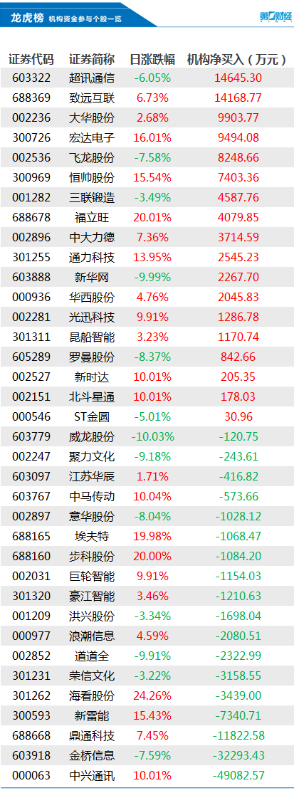 6月20日龙虎榜中,共36只个股出现了机构的身影,有18只股票呈现机构净买入,18只股票呈现机构净卖出。当天机构净买入前三的股票分别是超讯通信、致远互联、大华股份;当天机构净卖出前三的股票分别是中兴通讯、金桥信息、鼎通科技。