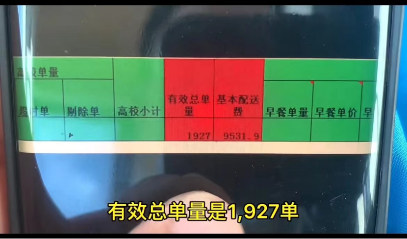 有效总单量1927单,夜宵单量64单,每单1.5元,加上全勤奖400元;