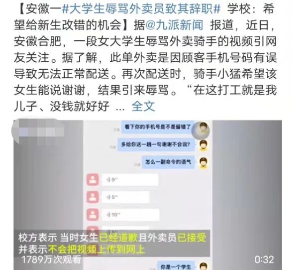 想起之前,一则“大学生辱骂外卖员致其辞职”的新闻,引起网友热议。