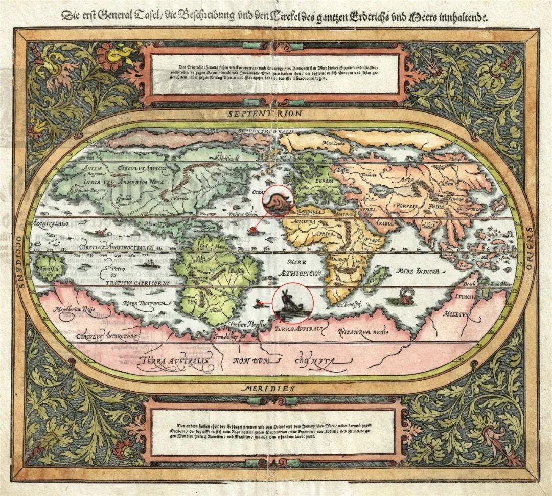 “海怪”已经被放大并圈出,你能猜出它是什么动物吗?在老祖宗还没有能够驯服各种海鲜时,他们也不忘在地图上标出它们的位置。(虽然他们把它们叫做“海怪”)后来,这些地标变成了著名的鳕鱼产地和渔场,真正造福了子孙后代!
