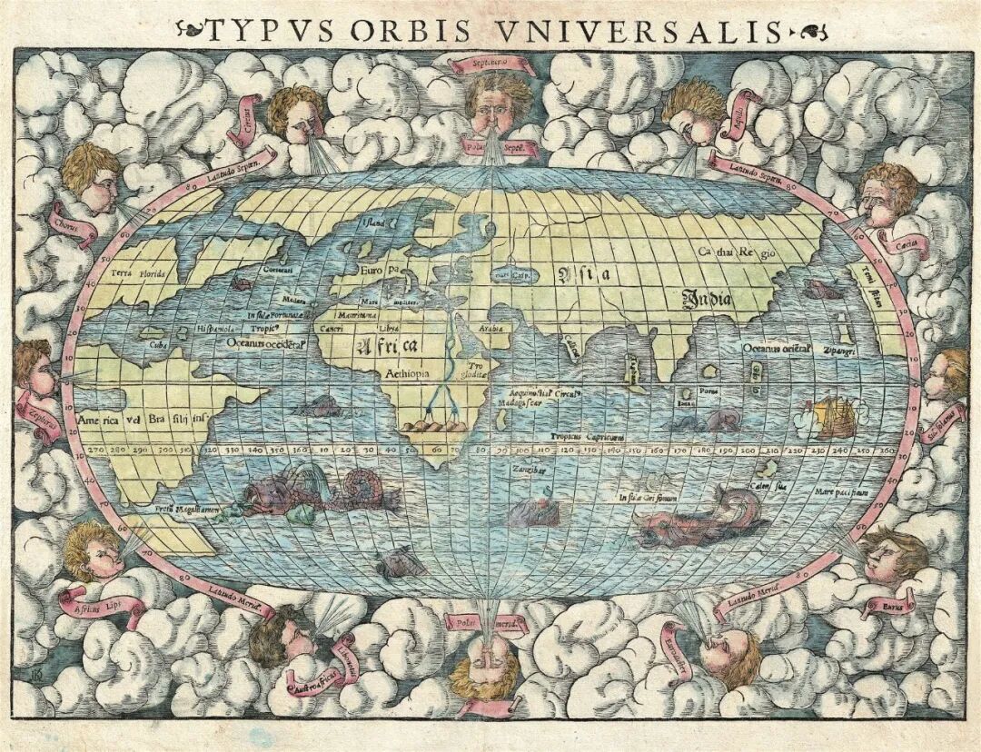 这张1550年代的地图展示了12个方向的风神吹向世界中心,还有许多海怪藏在波涛汹涌的海洋中。