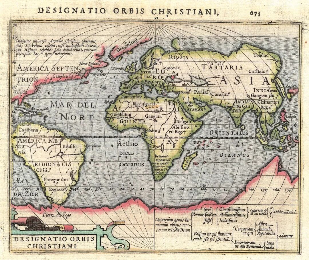 太平洋已经清晰可见,北美仍是未知之地,非洲的尼罗河被描绘成双湖水系。日本在地图上被称为“吉庞古”,这是马可·波罗用来形容这个神秘东方岛屿的旧名。这幅地图展示了“黑暗中世纪”时期,宗教势力的野心。