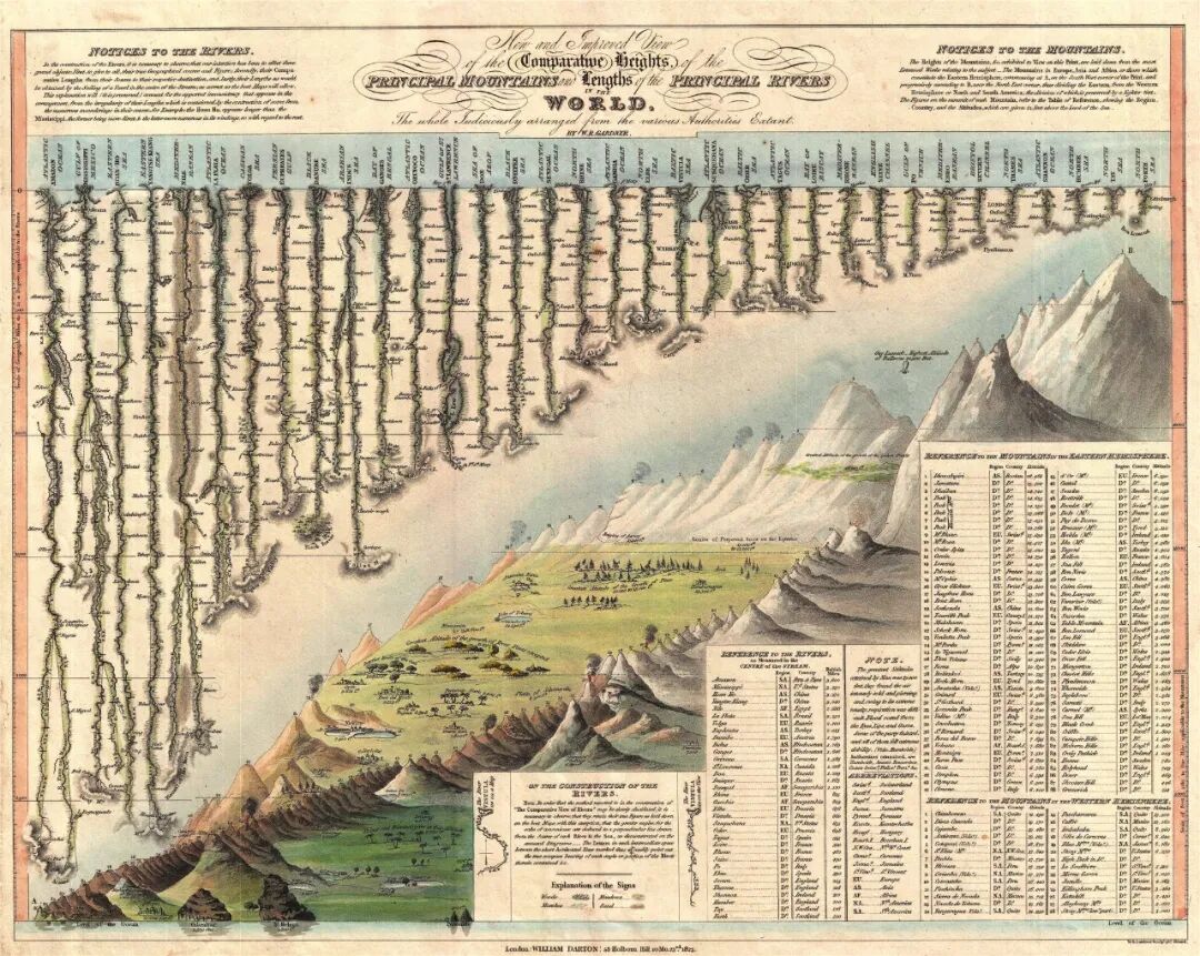 这张地图完全脱离实际地理意义,描绘的是乌托邦式的世外桃源。在一战刚结束,人们身心俱疲的时刻,带来了温柔抚慰人心的效果。还记得那株三叶草吗?它出现在1581年德国汉诺威的《班廷三叶草地图》上,属于T-O地图系列。这幅地图以三叶草的形状绘制了整个世界,象征着基督教的三位一体,海洋则填充了传说中的海怪。人类很自恋,能让人不以自己为中心绘制地图,这足以说明当时神学对人类的控制之深,也暗示了欧洲正经历的“黑暗中世纪”。还有《大清万年一统天下全图》,看看是否有你家乡的踪影。这张《世界主要山峰高度及河流长度比较图》是19世纪科学唯心主义的象征。那时珠穆朗玛尚未被测量,人类在一点点突破体能限制,探索世界。《全球海陆总图》出版于1794年,非常罕见,体量丰富、信息密集。它采用双半球投影系统,还有太阳系图、月相图、浪漫的星图,以及图表来阐述季节变化、天文计算,非常有料。本书采用大开本装帧,可完全平摊翻阅,也可用来典藏。
