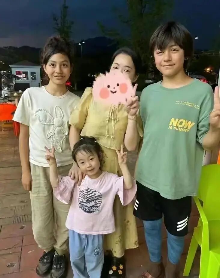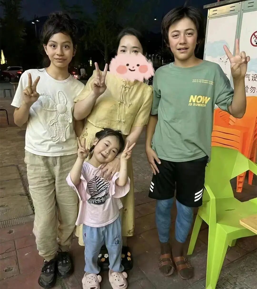 之前有粉丝与两个孩子合影。两个孩子的穿着都非常简洁,相貌也没有发生太大的变化。