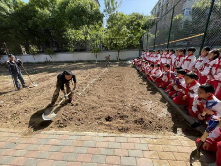 第一步:翻地。首先要学会使用农耕工具铁锹和五齿耙。各班利用科学课、大课间和快乐午间等时间来练习学习使用工具和翻地的技巧,年级还举办了一场翻地比赛。
