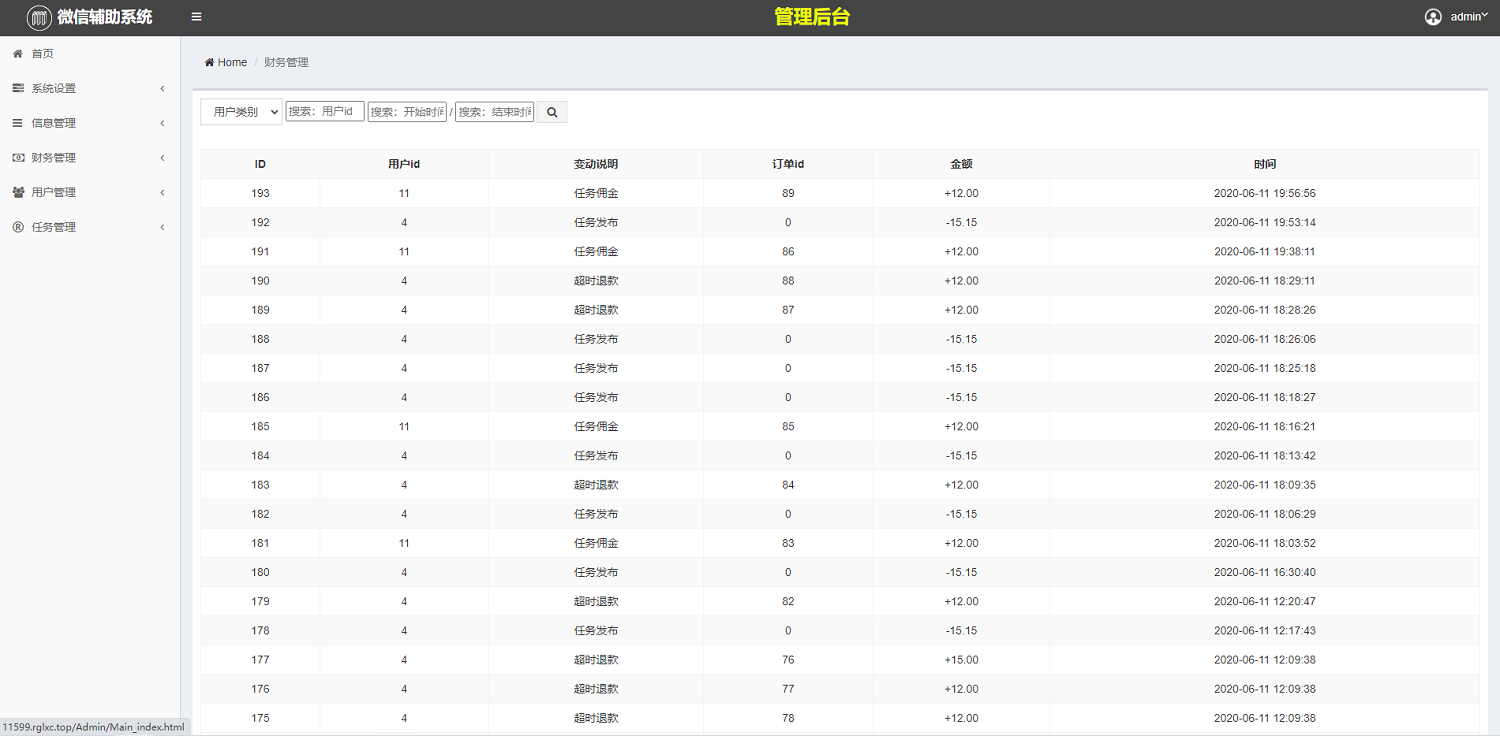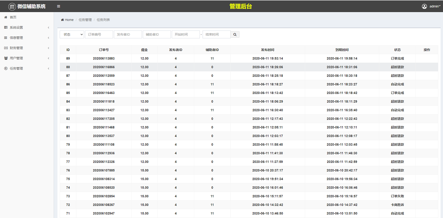 本系统包括:做单端、下单端、总后台三端。结合微信辅助流程,严格定制的一套自动化任务平台。