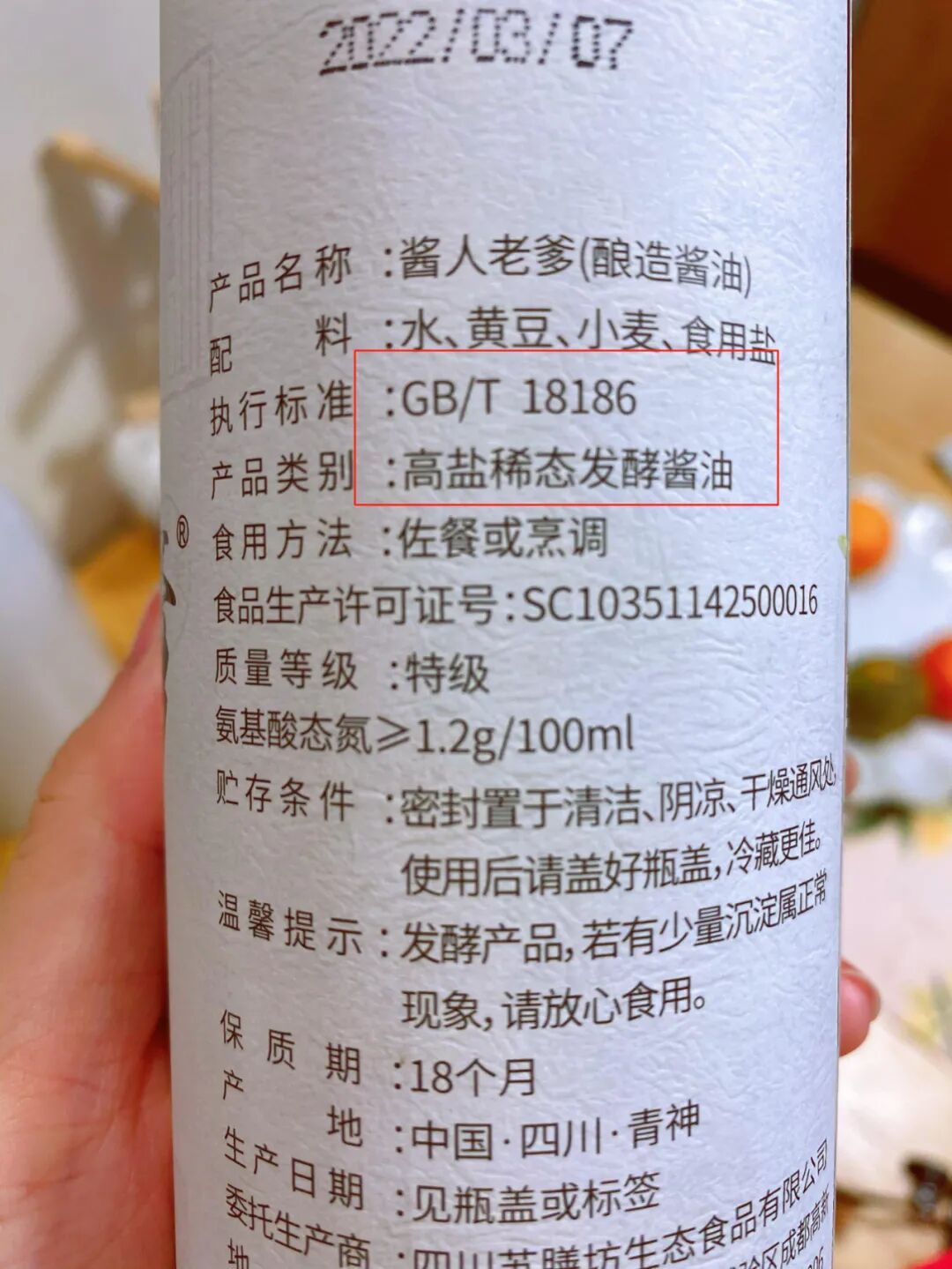 “GB/T 18186”代表酿造酱油。酿造时间较长,工序复杂。现代工艺只需要几天的功夫,在这里,却要枯燥乏味地等上几年光阴。但大自然和时间分解出的16种氨基酸所带来的鲜味和营养,是工业制法难以超越的。普通酱油是有一种说不出的工业味,原汁酱油则有一种自然浓郁的豆子酱香。普通酱油倒出来是浓的化不开的黑色,还有一种更差的是添加的焦糖色;老爹酱油则是一种自然透亮的琥珀色,放一晚上对比更明显▼