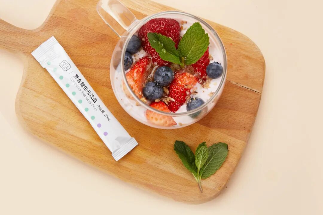 当然,还可以来一份无糖酸奶,搭配你喜爱的水果,做一个水果酸奶杯,加上一条益生元,下午茶也轻松做好了!