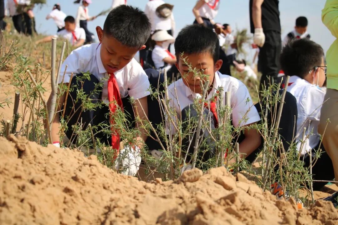 4年来,康巴什区第一小学共组织22期“红领巾”治理荒漠综合实践活动、6期实验室课程,近3500人次参与,埋设了沙柳沙障近200亩、纱网沙障80亩,种植沙生植物近40亩,成活沙柳沙障和沙生植物80多亩,固沙面积达到近400亩。这片飘扬着“红领巾”的治沙基地,也从一片荒芜披上点点“绿衣”。