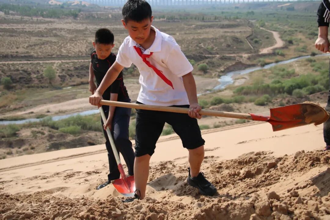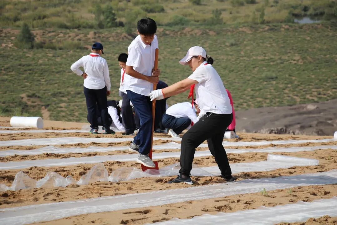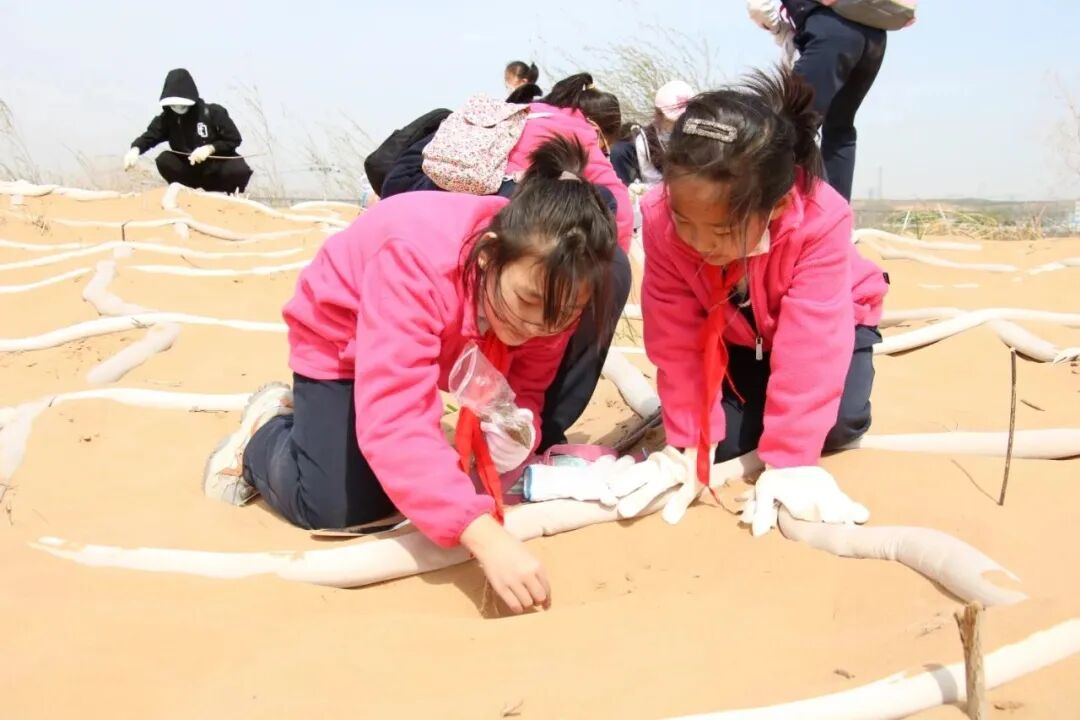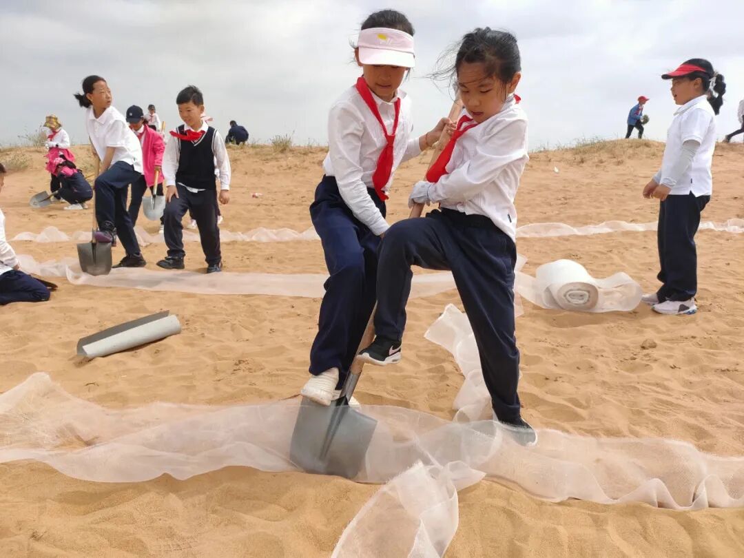“红领巾”治理荒漠综合实践课程是对课堂知识的延伸。许平介绍,实践课程在春秋两季进行,全校学生轮着上课,每次大约150名学生,每个班配有两名老师全程跟着,“老师会结合自己的学科内容在基地进行扩展”。比如数学老师会让学生计算设置沙障的面积,科学老师会指导学生把沙柳栽种在哪里成活率更高,音乐老师则带着孩子们在沙地放声高唱《劳动最光荣》,以此来缓解疲劳、振奋精神。