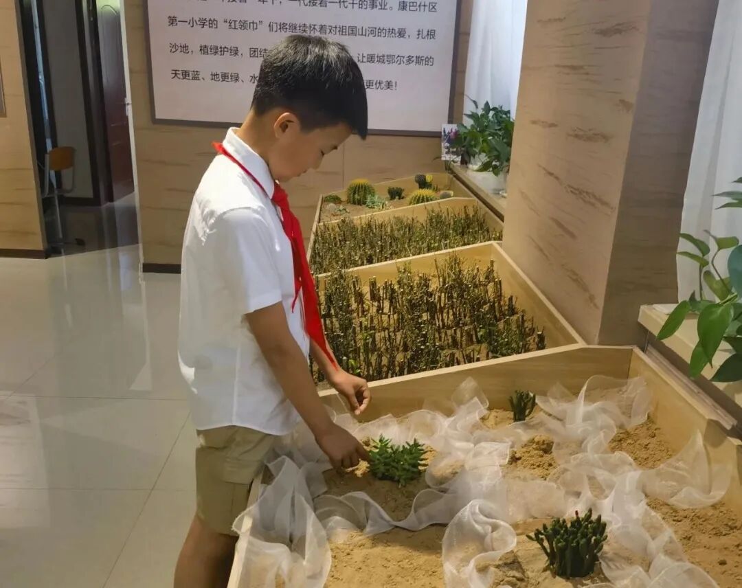 如今,康巴什区第一小学还在校内课程馆设置了“红领巾”治理荒漠展示区,分区展示沙障、沙漠种子、沙生植物标本,以及实践课程的照片、学生制作的沙画。秦焱说,考虑到低年级的学生体力比较差,他们可以先在课程馆内学习基础知识,还可以将基地采集的沙生植物带到实验室进行药水处理、脱水、密封,做成腊叶标本、浸制标本等多种样态的标本。