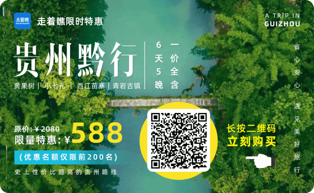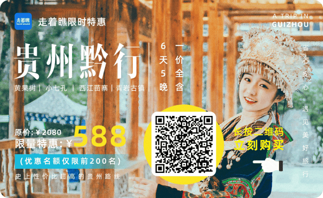 他们家的贵州线一直也是爆款线路,最近正好刚刚升级完,小编看了行程,吃当地特色住轻奢酒店,景点游玩的体验感也更好。所以小编特意给大家要了一些读者专属名额(限量),原价2080元6天5晚的贵州黔行路线,读者只要588元限量名额200个,拼手速的时候来了!