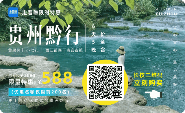 也可以立刻选走着瞧旅行贵州专线名额,用请朋友吃一顿大餐的钱(588元)、和一年内任意一个周末或节假日(一年有效期),去贵州看山水、看苗寨,来一场,属于你的爽爽的贵州之旅!