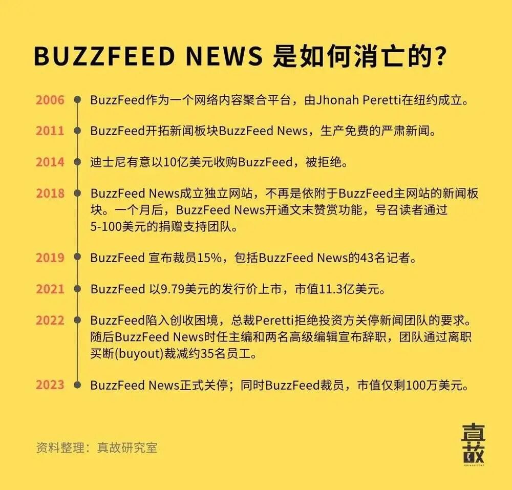 2022年,投资人要求关停耗费财力的BuzzFeed News,总裁Perreti裁减新闻团队35名员工以作妥协;2023年,BuzzFeed的净收入增长骤降-913%,市值仅剩100万美元。