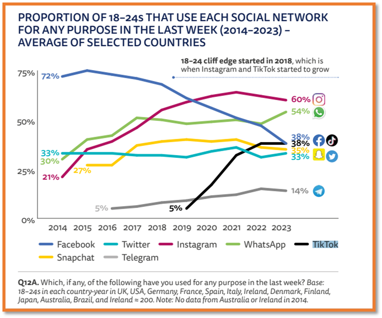 年轻一代逐渐抛弃了Facebook这样的传统社交媒体,去了TikTok和其他平台。路透社《2023数字新闻报告》指出,在西方国家18~24岁的年轻人之中,2014年有72%人使用Facebook,2023年骤降至仅剩38%人使用;与此同时,2023年TikTok的年轻人用户数达到38%,Instagram更是高达60%。简单来说,Facebook对于年轻人不再有足够的吸引力了。其用户变化曲线,似乎也与BuzzFeed的发展轨迹吻合。