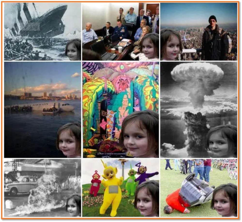 这个表情包的原图是一场火灾的现场,一个小女孩在被烧毁的房屋前露出了无奈又诡异的微笑。编辑们鬼使神差地把这个小女孩从图里抠了出来,然后挪到了其它背景里。
