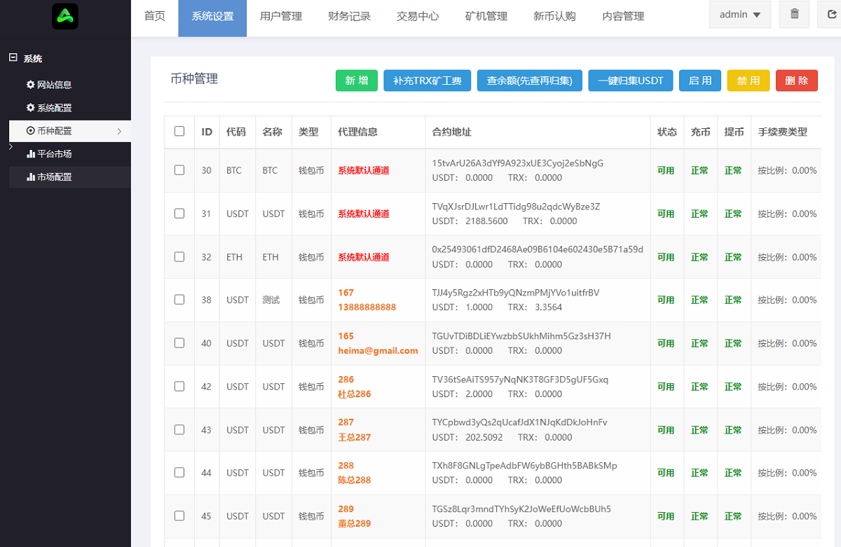 后台可以生成USDT地址,可以一键自动归集所有地址的余额到指定账户。