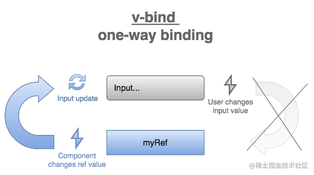 Vue中v-model的思路很简单。定义一个可响应式的text(通常是一个ref),然后用v-model="text"将这个值绑定到一个input上。这就创造了一个双向的数据流: