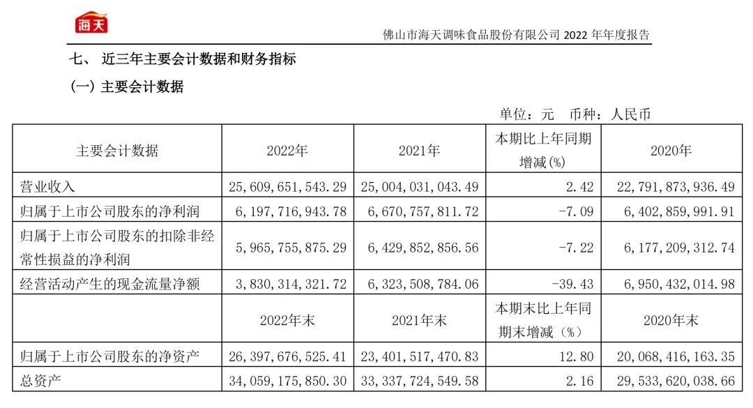 数据显示,2022年,海天味业营业收入256.10亿元,同比增长2.42%;净利润61.98亿元,同比下降7.09%;整体净利率24.22%,同比下降2.46个百分点。