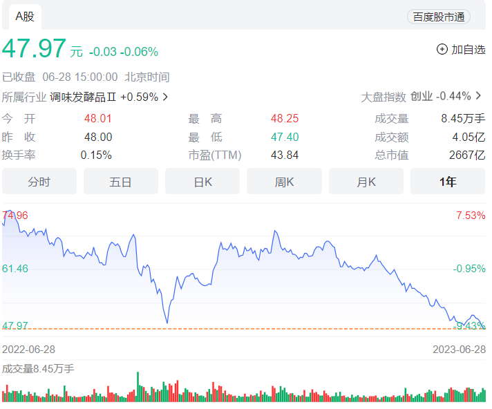 6月28日早盘,海天味业盘中最低价一度跌至47.4元。按前复权价计算,这一价位已跌破去年10月31日的低点。截至今日收盘,其股价在47.97元左右,总市值徘徊在2667亿元附近。
