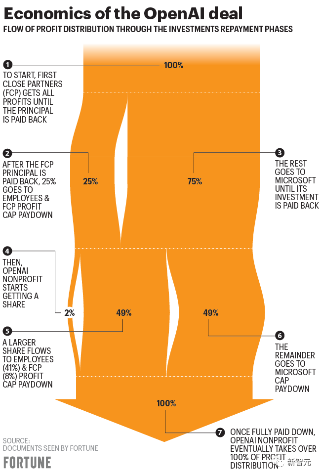 根据Fortune的报道,OpenAI和微软的投资协议中,对于投资的投资回报分为4个阶段:1. 企业利润先让以马斯克为首的首批投资者收回10亿美元投资,然后退出。2. 后续OpenAI利润的75%分配给微软,直到微软收回其130亿美元的投资。3. 在OpenAI的利润达到920亿美元之后,微软的持股比例下降到49%。剩余部分利润由其他风险投资者和OpenAI的员工分享。4. 当利润达到1500亿美元之后,微软和其他风险投资者的股权将无偿转让给OpenAI的非营利基金。从去年11月推出ChatGPT以来,OpenAI就一直是全世界媒体的头条新闻,甚至受到白宫邀请,与谷歌和微软等巨头一起讨论人工智能方面的立法。回想2015年,OpenAI刚成立之初,还是一家「非营利组织」。2019年,OpenAI正式转为营利性的初创企业,从微软获得10亿美元投资。马斯克还对此大为愤慨,认为和自己的经营理念不合,愤而退出创始人团队。如今,凭ChatGPT引爆的大模型飓风,OpenAI再从微软那里融资100亿美元,估值已经接近了300亿美元。在6月初的阿布扎比会议上,Sam Altman再次表示:「当我们开发出超级智能时,我们可能会做出一些让大多数投资者感到非常奇怪的决定。我不想被公开市场、华尔街等起诉……所以我们暂时不会上市,没有这一计划。」最近,Sam Altman参与的内部会议透露出:OpenAI目前严重受限于GPU,训练大模型动辄需要千万美元,何况每天还有ChatGPT的上亿用户在消耗着海量的算力资源。而坚持不上市就可以更注重独立性,不必过于受制于资本市场和商业利润。也体现出OpenAI确保研究成果惠及全球的初衷。从2015年到2023年,无论是成立之初的非营利组织,还是如今的营利性初创企业,OpenAI的目标始终如一——「以最有可能造福整个人类的方式」开发通用人工智能(AGI)。而在造福整个人类之前,OpenAI是否能造福自己的员工,就有待观察了。参考资料: