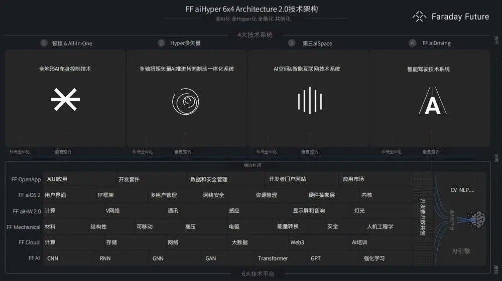 按照贾跃亭的创新风格,这次又造了一大堆新词,比如这次提出的6X4概念,是指FF六大技术平台和四大技术系统的垂直整合与横向打通。