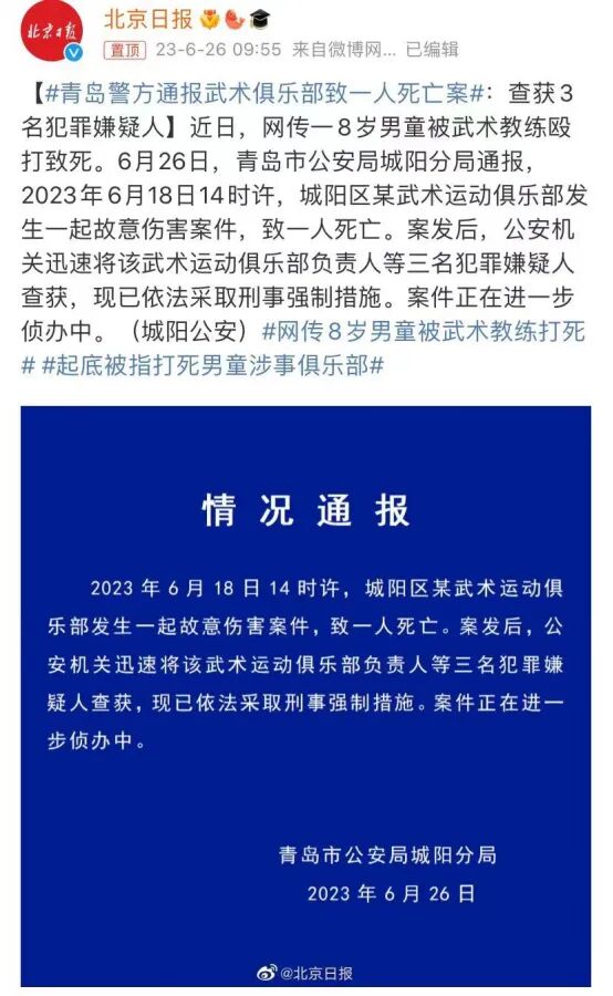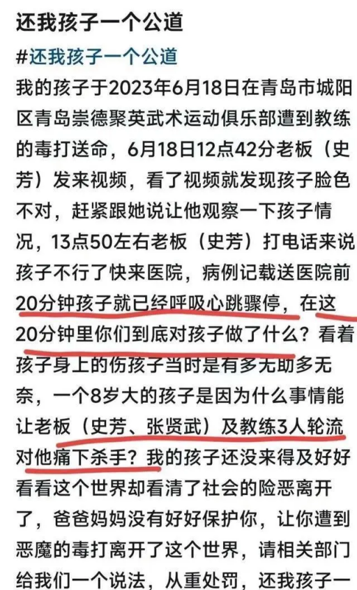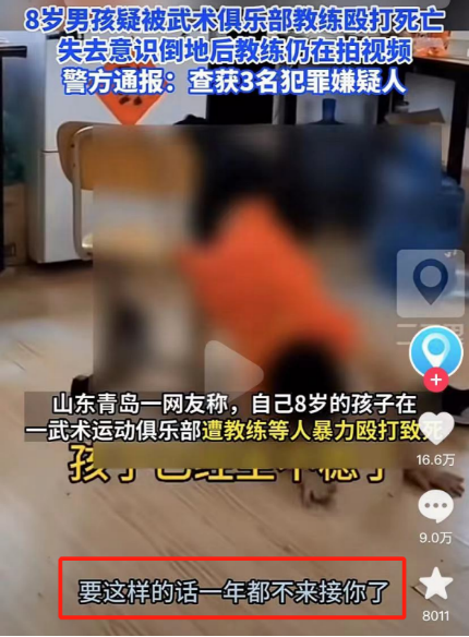 成为父亲的时间越久,我就越来越看不了那些孩子遭受伤害导致去世的新闻。上周,山东青岛的一家武术俱乐部里,就再次发生了一起孩童逝去的惨剧。最让我不忍和愤怒的是,这次不幸去世的男孩,是被武术教练活生生打死的。报道的视频中显示,穿着橙色衣服的被打男孩无力地靠坐在椅子上,一只脚的鞋子都已经被甩在一边,足以想象他曾遭遇了多么恐怖的暴力。接下来的场景更是让人无限揪心,本来就已经摇摇欲坠的孩子,根本已经无法正常地坐稳,很快就从椅子上跌落下来摔倒在地,双手发紫,奄奄一息。后续爆出的照片里,孩子的身体上也满是被打出的淤血和青紫,触目惊心。再看打人的教练,肌肉结实,拳头跟沙包一样大,还会武术。试问这样一个成年人的拳脚落在一个8岁孩子的身上,他怎么可能受得了?把孩子送去武术学校,是想让他强身健体保护自己,可才学了不到两天,孩子就不明不白地被活活打死在那里,再也无法醒来。而最令人气愤的是,孩子在被殴打到身体出现严重状况,甚至失去意识后,教练和校长并没有第一时间将孩子送医,而是拍起了视频。直到孩子呼吸停止20多分钟后才被送到医院,已经错过了最佳的救治时机。在孩子母亲的控诉里,我们可以看到,孩子死于颅脑损伤、颈椎骨折、心肺功能衰竭等多重原因。视频末尾,校长跟孩子说:“你妈妈说了,再这样一年都不接你回去了。”并且最后还把视频发给了孩子家长。我觉得这不仅仅只是一起意外伤害案件,而是实实在在对未成人的侵害,是彻彻底底的教育方式错了。这个武术学校应该被彻查,现在一个孩子被打死了,还会不会有下一个孩子?在很多老师和家长根深蒂固的思维里,似乎没有什么是打一顿不能解决的问题。“打你,是为了让你好好学武”、“打你,是为了让你听话”,这样的言论,听上去合理,但细想之下,完全就是荒谬的。孩子的妥协,并不是真正意义上的妥协,而是因为恐惧和害怕而已。许多孩子经历了非人的折磨和体罚之后的结果,只是恨意被无限放大,要么受伤、患上心理疾病,要么在“棍棒教育”下,变得越来越叛逆,直至棍棒教育也解决不了。很多老师和家长,之所以仍旧在相信“棍棒底下出孝子”的这一套说辞,往往是因为代入了自己。他们觉得,自己小时候,父母都对自己实行过“棍棒教育”和简单粗暴的打骂,为什么他们那一代没有出现问题?他们把错误完全归结给孩子,从不去想是不是自己的教育方式有问题。这样的心理,也就导致他们对自己的棍棒和打骂会给孩子们带来多大的伤害毫无概念,更想不到会将孩子逼上绝路。就在我撰写这篇文章的时候,合肥长丰就又发生了一起孩子跳楼事件。视频里的那个小男孩,瑟缩在空调外机上,场面极其危险。而他的家人却根本不当回事,仍旧拿着一根粗长的棍子击打着孩子。最终,在一众围观者“别打孩子”的喊声里,男孩还是被棍子逼得跳下了5层高楼,身体多处骨折,目前仍躺在医院里接受救治。孩子都已经被逼到空调外机上了,这已经是明摆着的危险,可家长想的却还是用棍子把他“教育”回来。浙江义乌福田小学的孩子明明已经被打得皮肉青肿了,可老师和家长们不以为意,还要当成典型教育案例发到群里。河北邯郸16岁初三学生被体罚至昏倒,老师却不紧不慢,态度冷漠,甚至连校医都不叫。那个用武士刀刺死自己孩子的父亲,之前就多次体罚自己的孩子,儿子最后一句话是:爸爸,我在好好学习……这些老师和家长最大的错误,就是把父母曾在自己身上的实践过的“成功经验”,生搬硬套到了如今的孩子身上。在如今的时代背景下,你再用老一辈“棍棒底下出孝子”的过时教育方式去对待孩子的话,只会适得其反,酿成悲剧。为什么过去的孩子打也打得骂也骂得,放在今天就行不通了?这个问题,百家讲坛的赵玉平老师有一个非常精彩的解读。赵玉平老师说,简单粗暴的棍棒教育在过去之所以有用,是因为那个年代物资短缺,简单粗暴就是支持。但现在的孩子能够得到太多的信息,太多的物质满足,拥有太多的关爱,简单粗暴的方法自然就不起作用了。首先,在过去那个物质普遍匮乏的年代,孩子最关心的就是吃饱穿暖的问题,注意力被分散了,谁还会管你有没有被老师和家长打骂?那个时候的世界观就是,只要能出人头地,只要能吃饱穿暖,打一顿骂一顿又算得了什么?而如今,孩子们的物质条件已经相对富足了,不需要关注吃饱穿暖的问题,而我们孩子的注意力自然就会放在自尊和个性上面。这个时候你再去当众打他一顿骂他一顿,羞辱他们的自尊,他们内心的感受就会被放到无限大,甚至是比杀了他们更难受。以前的父母95%没文化,人人脾气上来都骂孩子垃圾,你父母骂你一句垃圾,你觉得再正常不过。现在的父母80%有文化,别人的父母都温柔慈爱的鼓励孩子加油,只有你父母骂你垃圾,你什么感受?以前的父母95%信奉棍棒教育,家家打得头破血流,你妈打你一耳光,你乖巧的自我反省。现在的父母60%反对棍棒教育,别人的父母耐心指导孩子的错误,你妈上来就是一耳光,你什么感受?其实,从来就没有“现在的孩子变得脆弱难养”,而是以前的孩子也心灵脆弱,只是因为各种原因,并没有得到像今天这样的重视。我们不能再如当年自己的父母那般,挥着皮鞭赶他们走,而是要让他们学会自己奔跑。