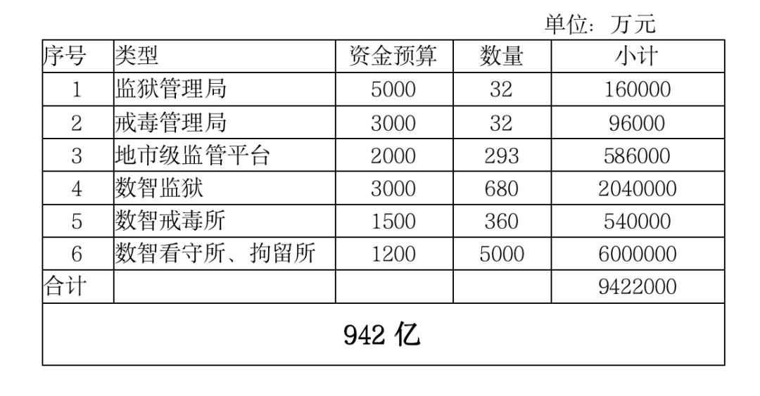 目前全国共有监狱680余所,强制戒毒所360余个,看守所/拘留所5000余个,累计监所6000余个;经整理近年来全国各地监所的招投标公开信息显示:平均每个戒毒所、看守所信息化投入1000—3000万;每个监狱信息化投入3000—5000万;省市级监狱管理局、戒毒管理局投入5000万以上,司法、公安数智监管总体市场容量估算如下: