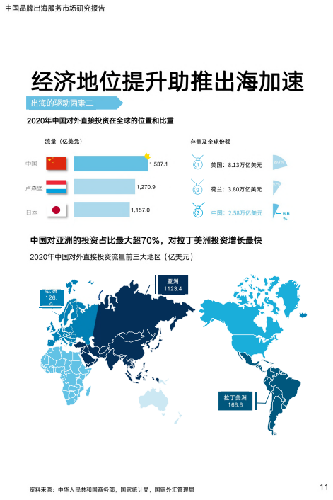 亿欧智库发布《2022中国品牌出海服务市场研究报告》,本报告从中国品牌出海的背景和发展历程出发,梳理品牌出海的驱动因素、走出去的动因及过程中的主要挑战;同时,报告关注品牌背后的服务商,探究他们脱颖而出的关键。报告认为,品牌商和服务商都要从中国视角下的“出海思维”转变为真正的全球化思维;海外不仅是卖货的目标市场,尽快成为全球化的公司,才能建立起真正的护城河。