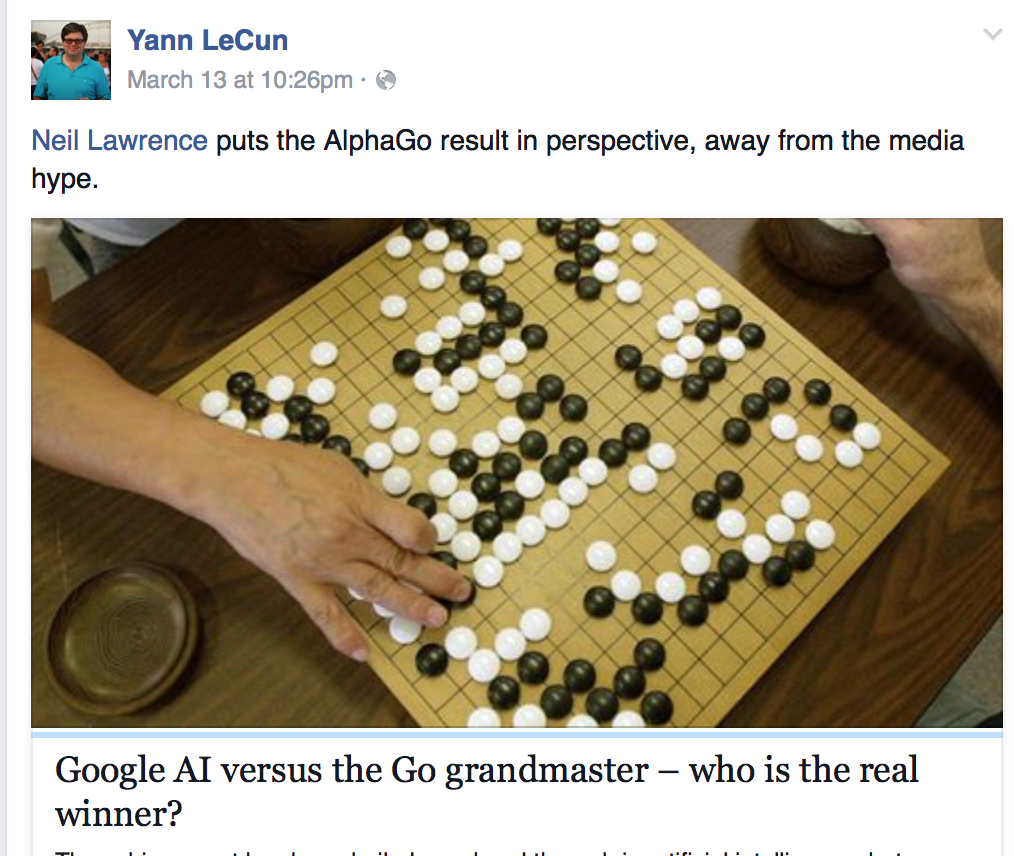 AlphaGo战胜李世石后,全球掀起了一股创业浪潮。仅中国大陆,一年便诞生了528家AI创业公司[9]。这个过程中,最失意的莫过于Facebook和杨立昆,从杨立昆当时更新的Facebook动态来看,他对Google的先声夺人相当不甘心。来源:远川研究所