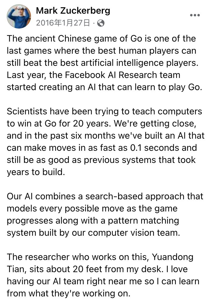 2016年1月,Facebook的创始人扎克伯格在自家平台上公布了一则重磅新闻:Facebook秘密研发的围棋AI机器人即将取得突破。