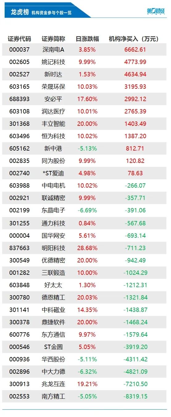 6月29日龙虎榜中,共29只个股出现了机构的身影,有11只股票呈现机构净买入,18只股票呈现机构净卖出。当天机构净买入前三的股票分别是深南电A、姚记科技、新时达;当天机构净卖出前三的股票分别是南方精工、兆龙互连、中大力德。