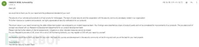 该公司让其事件响应小组分析了大众汽车信息娱乐系统的漏洞,后来又让研发部门分析了这个漏洞。随后他们向上述电子邮件截图中名为 "zj3t "的用户确认了该漏洞,并表示该漏洞是一个产品质量的问题,会及时改进。