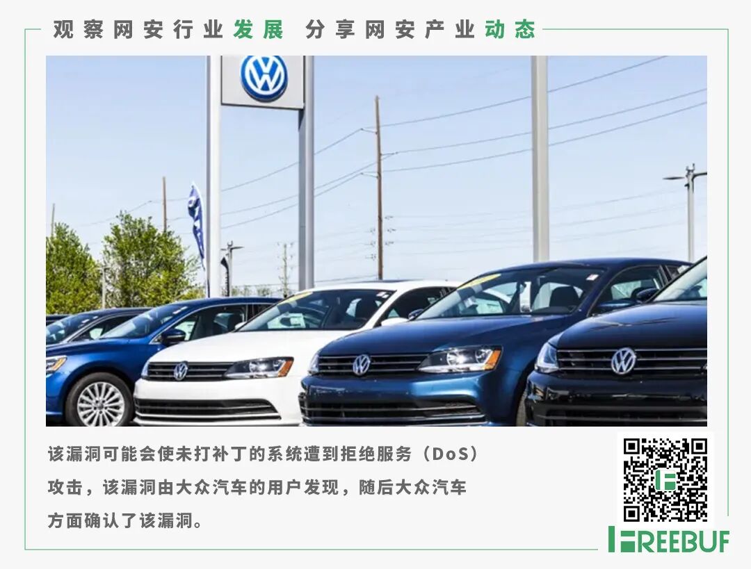 该漏洞可能会使未打补丁的系统遭到拒绝服务(DoS)攻击。该漏洞起初是由大众汽车的用户发现的,随后大众汽车方面确认了该漏洞,漏洞的标识为CVE-2023-34733。