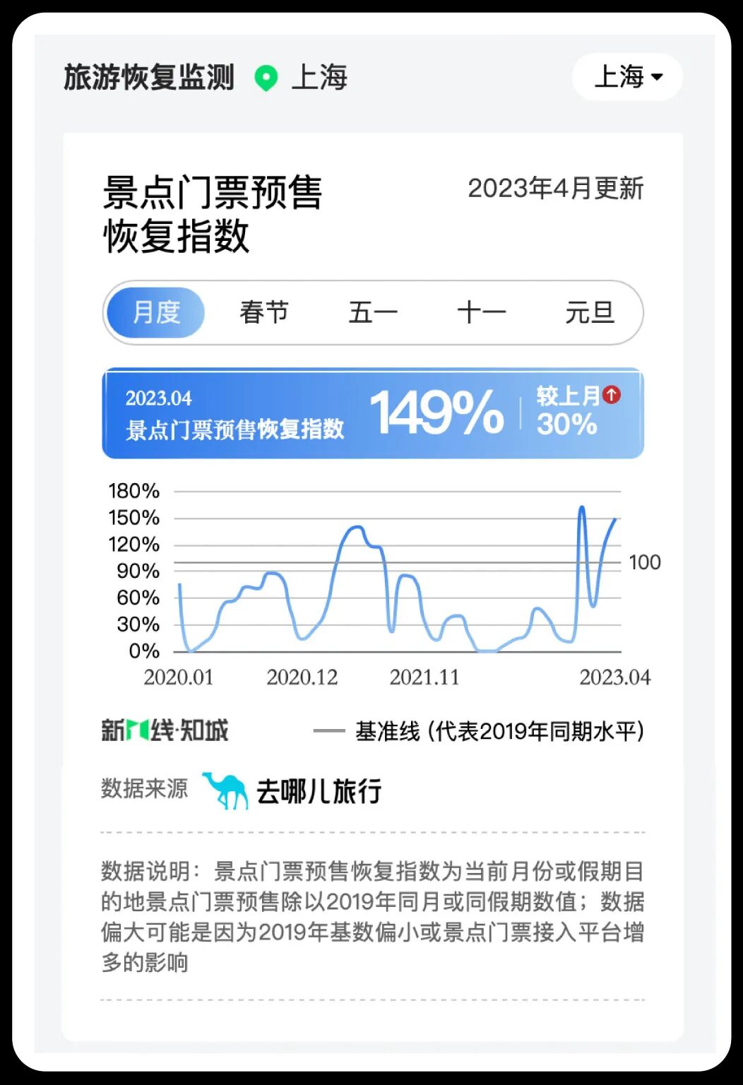 传统旅游大市如上海,自然也迅速回血。经去哪儿旅行数据测算的上海市景点门票预售恢复指数,在2023年春节期间出现小高峰,2月有所下滑,但很快重拾上升势头。这里需要特别指出,部分城市如淮安4月份景点门票预售恢复指数超过1000%,数据偏大可能是2019年基数偏小或景点门票接入平台增多的影响。