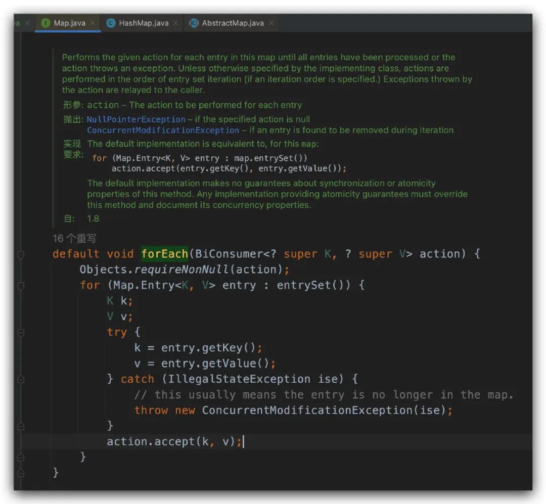 该方法被定义在 java.util.Map#forEach 中,并且是通过 default 关键字来标识的,如下图所示。这里提个问题,为什么要使用 default 来标识呢?欢迎把你的答案写在评论区。